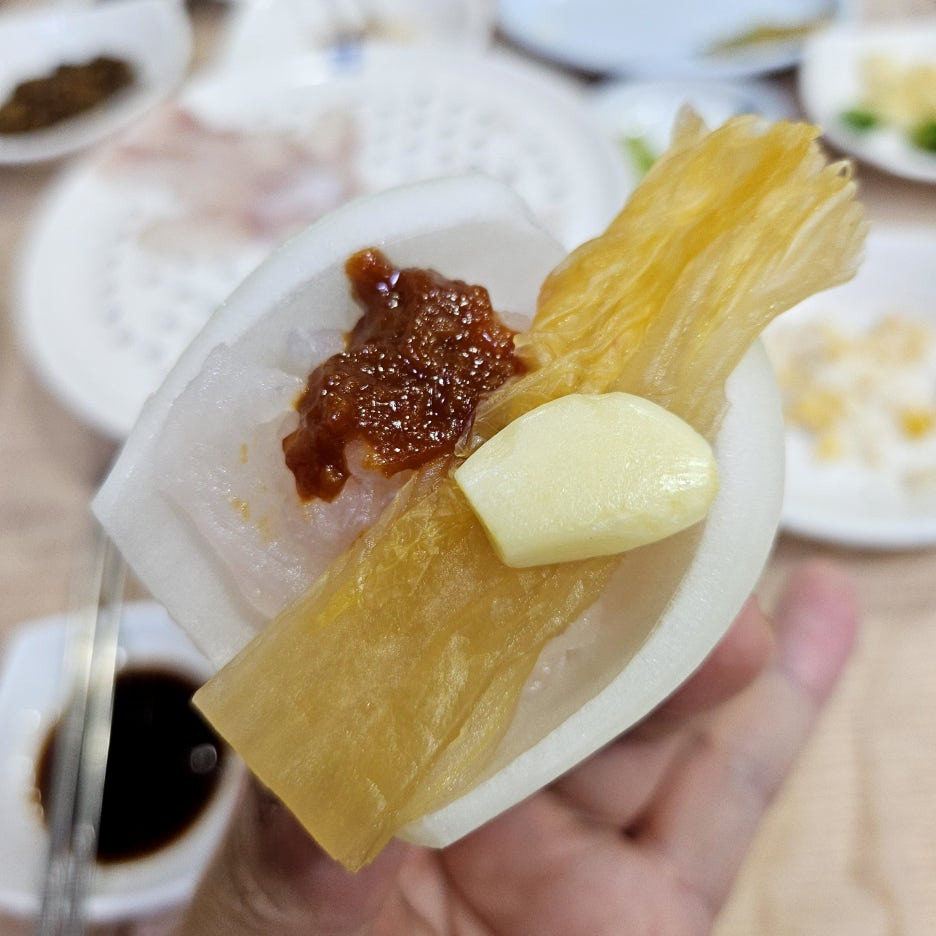 다행히도 쌈을 싸먹으니, 하모의 뼈가 크게 느껴지지 않았다. 그래서 이렇게 쌈으로 먹기로 한다. 회를 쌈으로 먹는 것을 그다지 선호하지 않지만, 어쩔 수 없는 선택이다. 하지만, 이렇게 먹는 맛도 개성이 있어 좋은 듯.