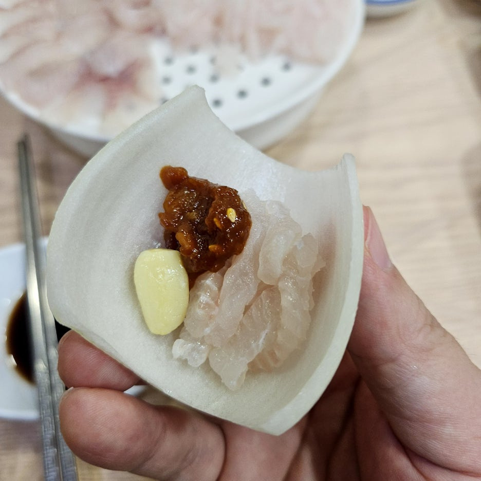 그다음은 양파와 함께. 하모 샤부샤부의 경우에는 양파를 적극 활용해서 먹는 것으로 알고 있는데, 회도 그렇게 먹는 방식인가 보다. 양파의 매운맛은 거의 느껴지지 않아서, 이렇게 먹는 것도 아주 맛있었다.