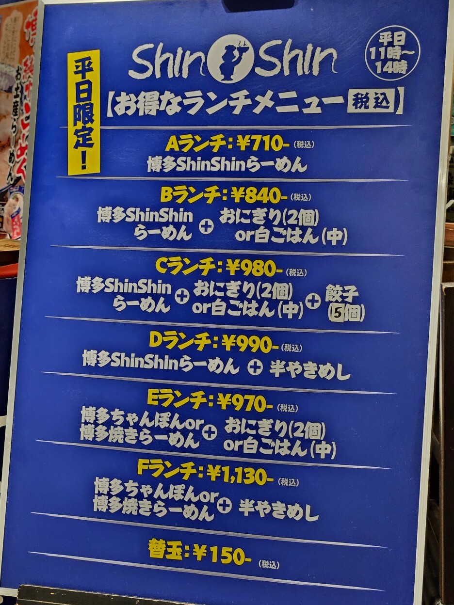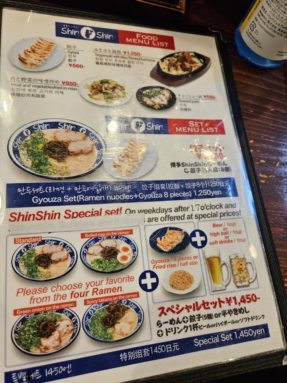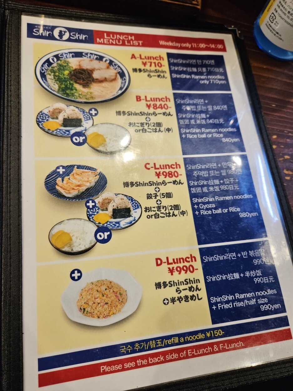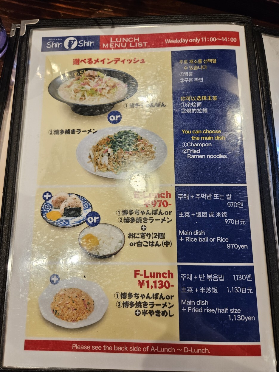 신신 라멘은 평일 한정 다양한 런치 세트 메뉴가 있다. 일본 장기 여행을 하면서 지출이 컸기에 조금이라도 아껴보고자 이 런치 세트 메뉴를 먹고자 했고, 그래서 점심시간대에 방문을 했다. 사실 원래 점심을 느지막하게 술집에서 스시와 함께 하려 했는데 런치 셋트 메뉴가 2시까지라 순서를 바꿔 신신 라멘에 먼저 온 것. 원래 가격은 1,130엔 정도 되는 신신 라멘(760엔)과 반 볶음밥(370엔)의 D 세트로 990엔에 주문했다.