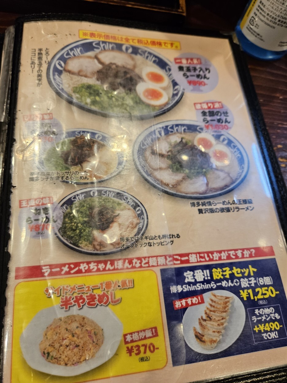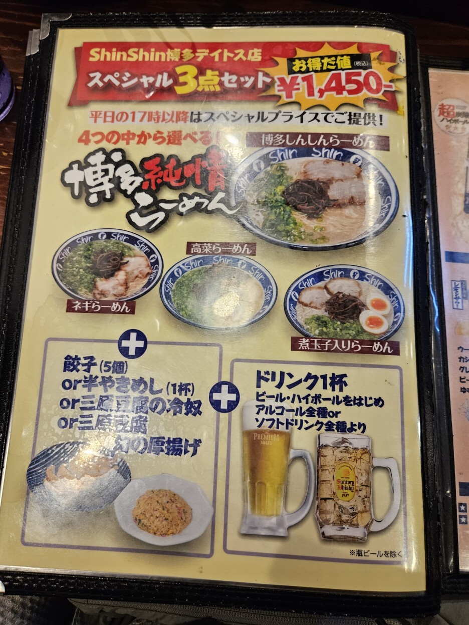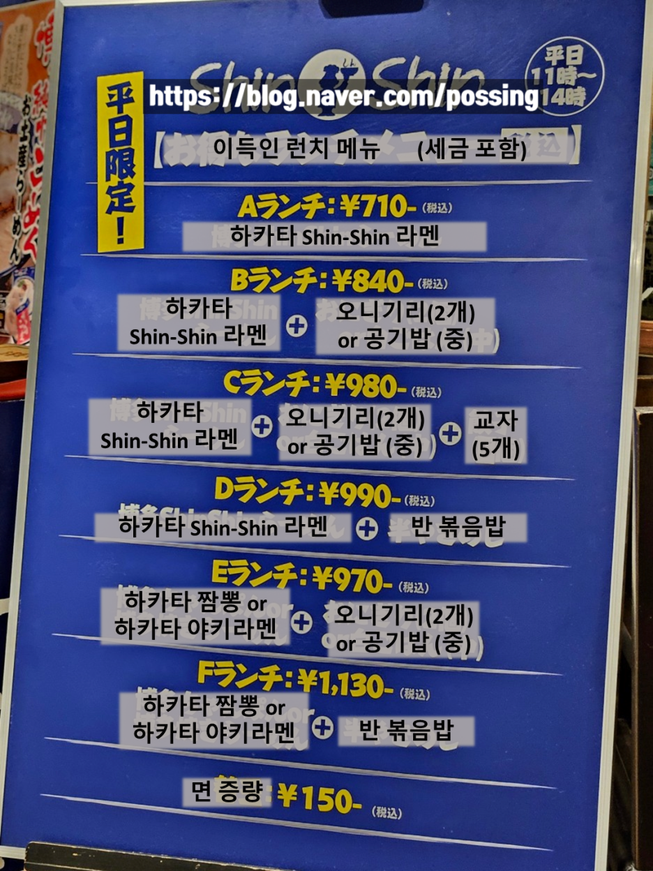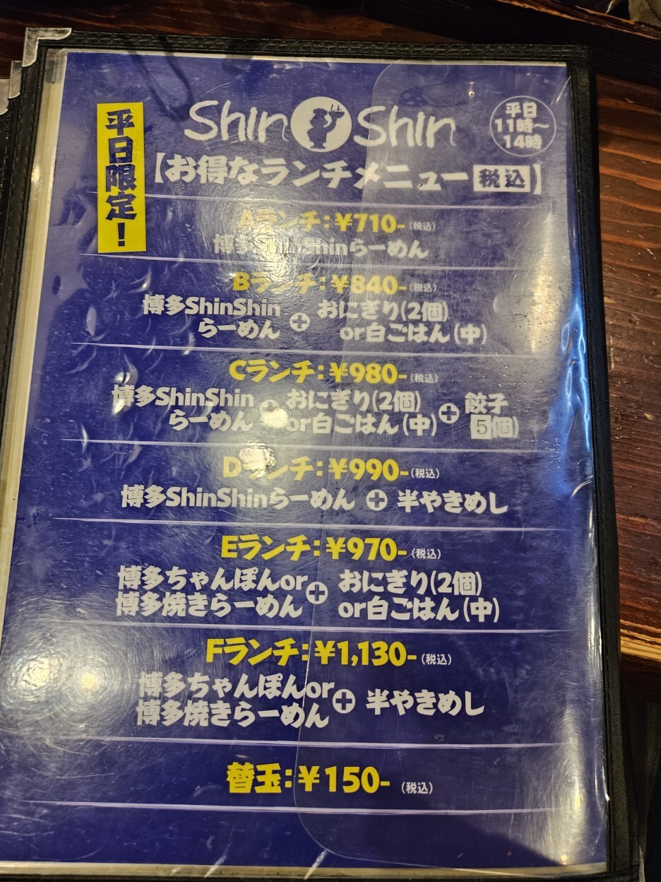 신신 라멘은 평일 한정 다양한 런치 세트 메뉴가 있다. 일본 장기 여행을 하면서 지출이 컸기에 조금이라도 아껴보고자 이 런치 세트 메뉴를 먹고자 했고, 그래서 점심시간대에 방문을 했다. 사실 원래 점심을 느지막하게 술집에서 스시와 함께 하려 했는데 런치 셋트 메뉴가 2시까지라 순서를 바꿔 신신 라멘에 먼저 온 것. 원래 가격은 1,130엔 정도 되는 신신 라멘(760엔)과 반 볶음밥(370엔)의 D 세트로 990엔에 주문했다.