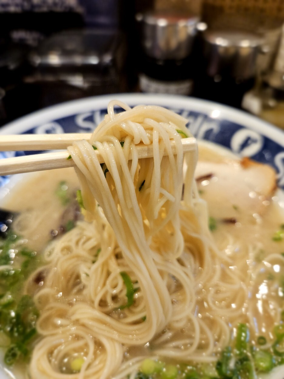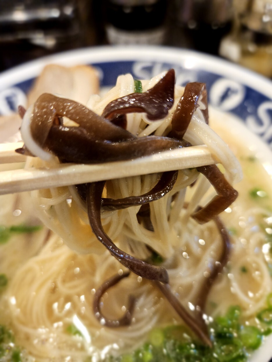 국물 한입. 괜찮긴 하다. 많이 짜지 않고 적당한 묵직함이다. 돈코츠의 향이 좋다. 면은 아주아주 가는 세면이다. 국물이 잘 묻어 올라온다. 후쿠오카의 돈코츠 라멘들이 다 이런 면이던데 역시 국물과 잘 어우러지는 형태인 듯하다.