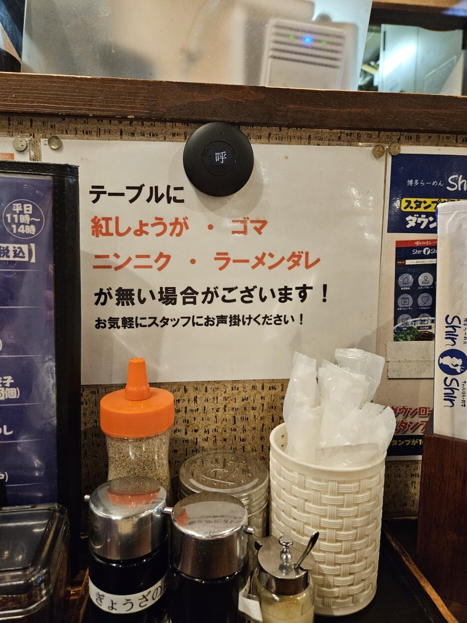 카운터석에는 맥주나 하이볼과 맞는 안주들의 사진도 붙어 있고, 우리나라처럼 벨도 붙어 있다. 테이블에 생강, 참깨, 마늘, 라멘 소스가 없을 수 있으니 편하게 직원을 불러달라는 안내판. 그리고 없을 수 있다던 참깨, 마늘, 생강 다 비치되어 있고, 교자 간장, 후추도 있다. 젓가락도 한번 찍어본다.
