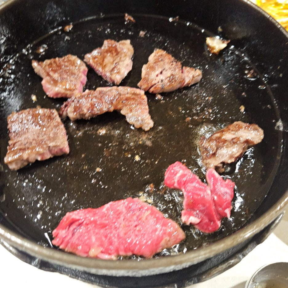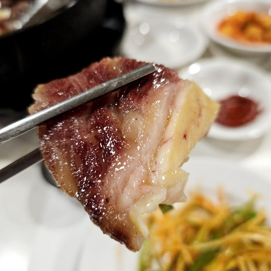 불판에는 딱 한 점 또는 두 점씩만 올려서 가장 먹기 좋은 타이밍에 먹는 걸로. 좀 천천히 먹게 되더라도 이렇게 조금씩 굽는 게 가장 좋은 방법이다.