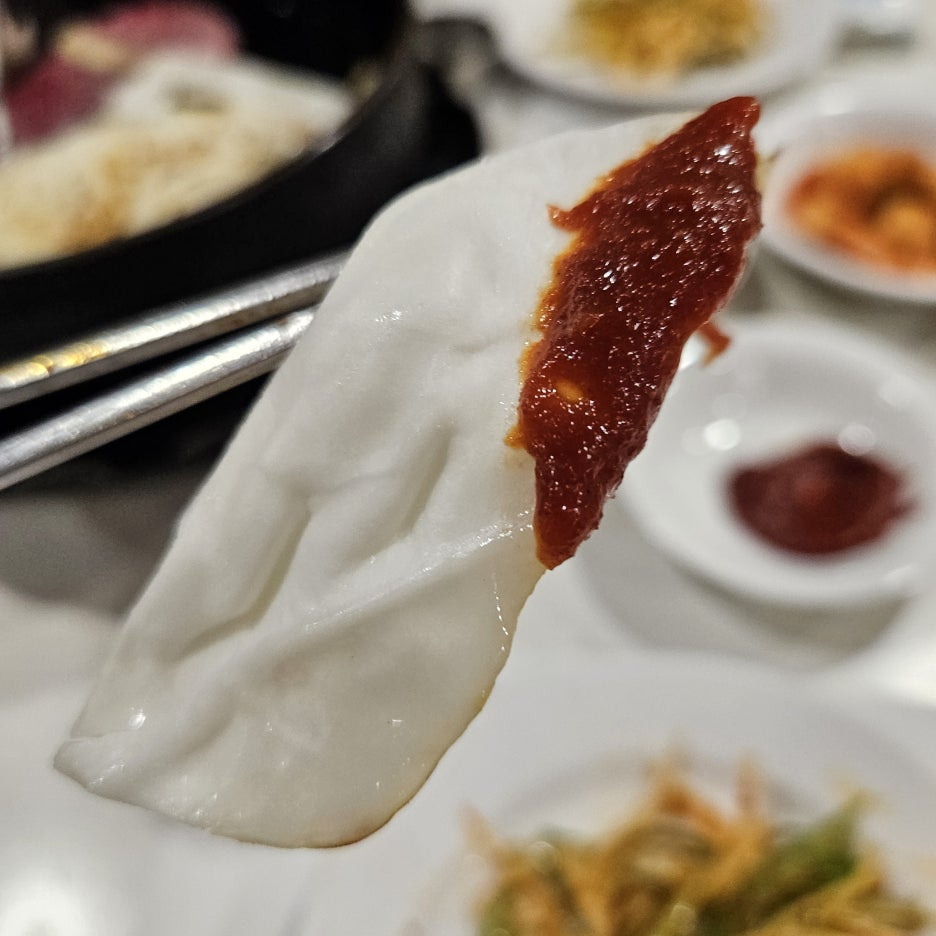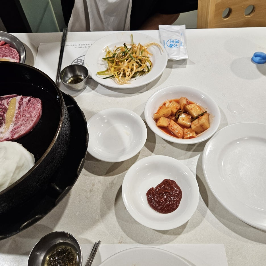 뒤늦게 보여드리는, 상차림 샷. 빈 접시 두 개는 모두 불판에 이미 올라가버린 마늘과 양배추였다.