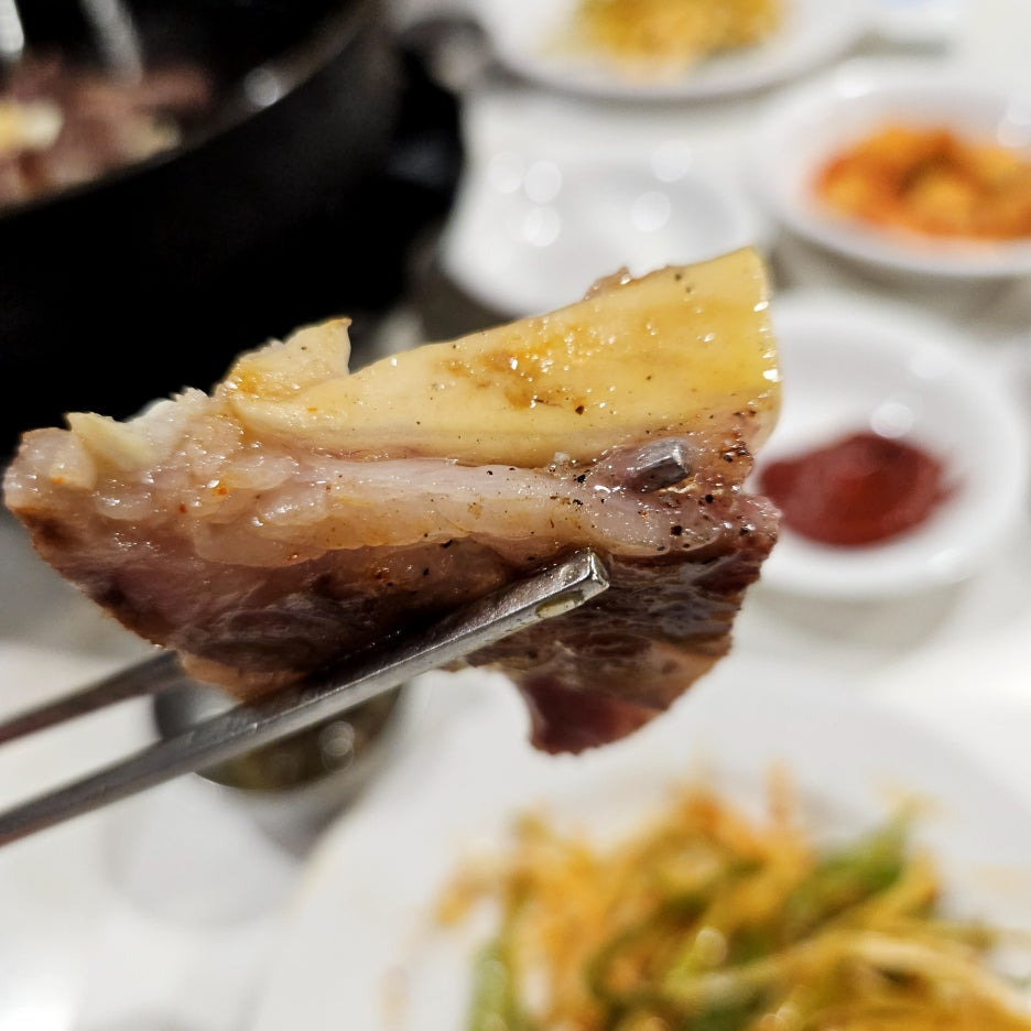 고기를 잘 보면, 종류가 다른 것으로 보일 것 같다. 왼쪽은 일반 등심이고 오른쪽은 떡심이다. 떡심이란 노란색으로 보이는 것을 말하는 것으로 소의 인대라고 한다. 이 떡심 주변의 고기가 항상 맛있기 때문에 무조건 2인분을 주문하면 "반반으로 2인분 부탁드립니다"라고 주문한다.