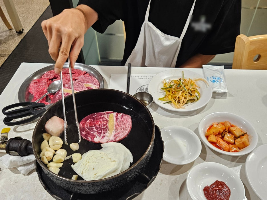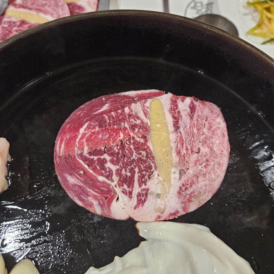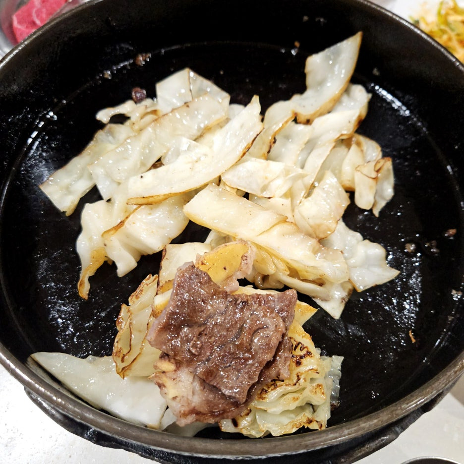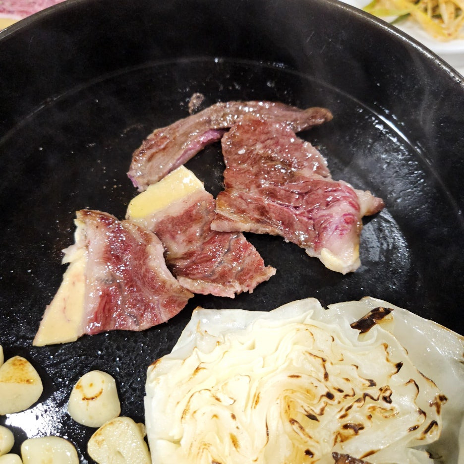 오늘은 떡심도 아주 퀄리티가 좋아 보인다. 얼른 무쇠판에 고기를 올리고, 항상 그렇듯이 양배추와 마늘도 함께 올라간다.