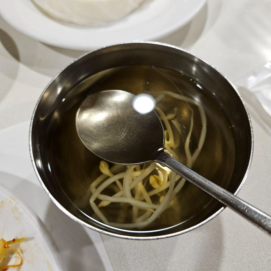 고기와 함께 먹으라고 내어주신 콩나물국. 원래는 깍두기 볶음밥 등 식사를 주문하면 내어 주시는데, 오늘은 한가하셔서 그런지 먼저 주신다. 별로 들어간 것 진짜 없는 콩나물국은 파무침의 매운맛을 없애주고, 등심의 기름짐도 어느 정도 없애 준다. 훌륭한 중간 정리용 음식이다.