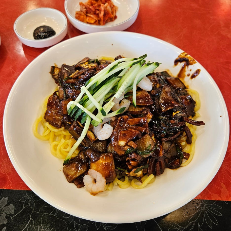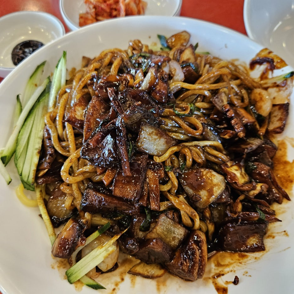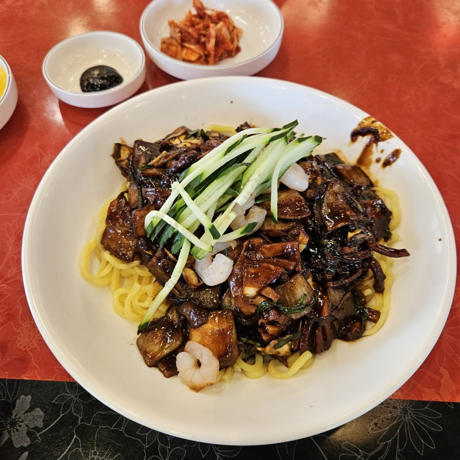 빠르게 나온 간짜장. 시간이 오래 걸리지 않은 것으로 보면, 수타면을 미리 만들어두고 그걸로 조리를 하는 것 같다. 오이가 한가득 올라가 있는 것이 좋다. 달걀 프라이는 없었지만 오이가 있는 것만으로도 차별화가 되는 느낌.