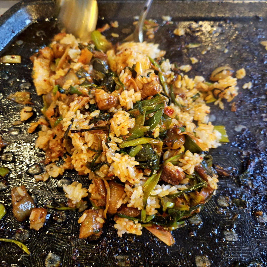 직접 열심히 볶아 본다. 직전에 파김치를 더 요청해서 미리 잘라 두었더니 양념도 딱 알맞은 듯.