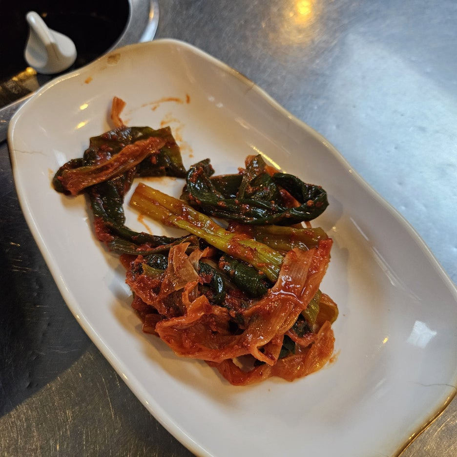 유일한 반찬인 파김치. 그냥 먹어도 꽤 괜찮았는데, 나중에 불판에 곱창 기름에 구워지니 더 맛있더라.
