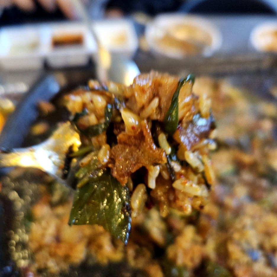 잘 눌어붙어 있는 부분을 떠서 한입. 맛있다!!