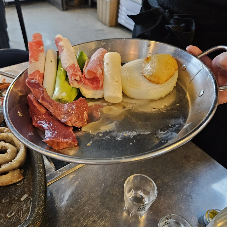 아직 불판에 올라가지 않은 녀석들의 모습. 몇 점 남은 차돌과 염통, 파, 떡, 감자, 양파.