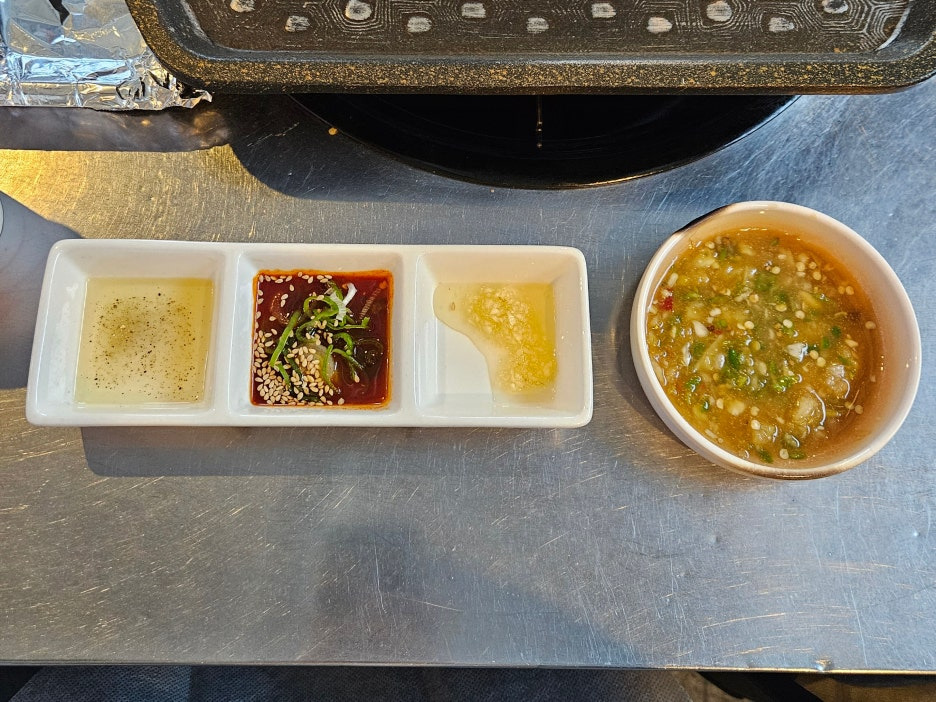 소금 기름장, 초장 베이스의 소스, 올리고당과 마늘 소스가 하나의 접시로 제공되었고, 보통 많이 접할 수 있는 새콤한 소스는 크게 한 접시로 나왔다. 올리고당 마늘 소스는 나중에 떡을 찍어 먹을 때 좋았다.