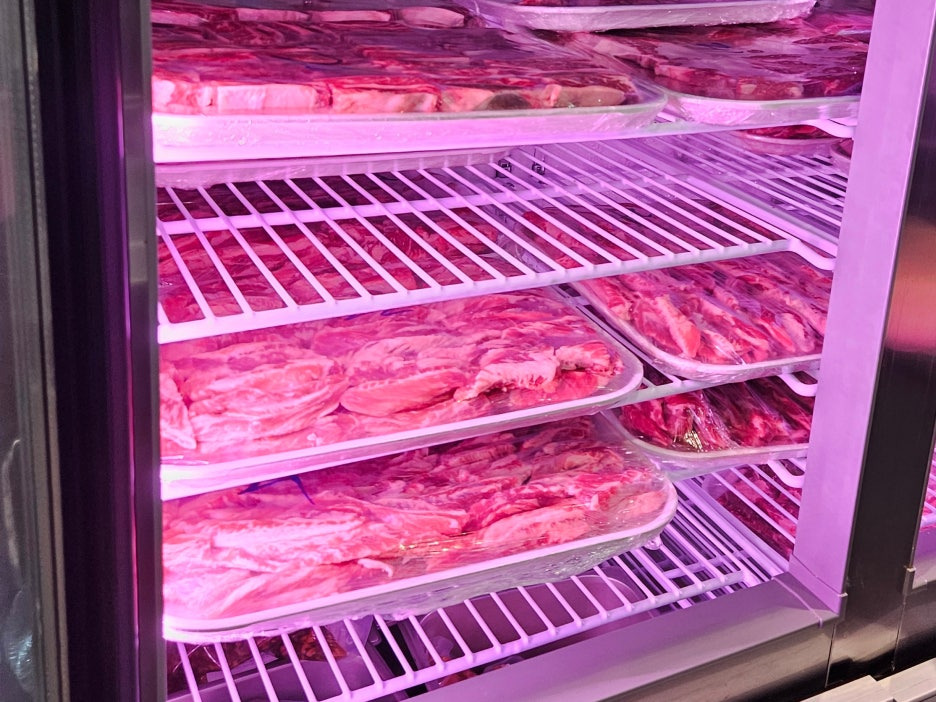 한쪽 편에 고기 냉장고가 있어 살짝 들여다보니, 꽤 퀄리티 좋은 고기들이 숙성되고 있는 모습.