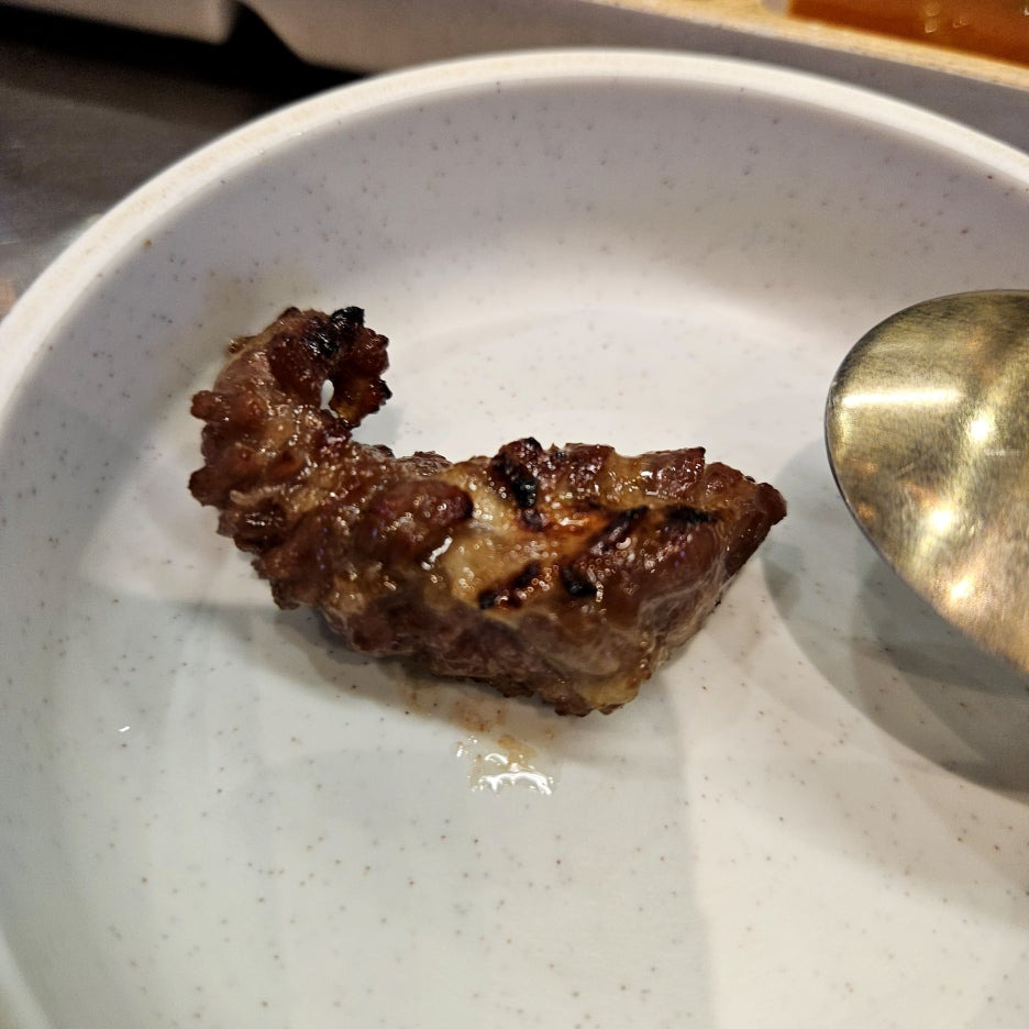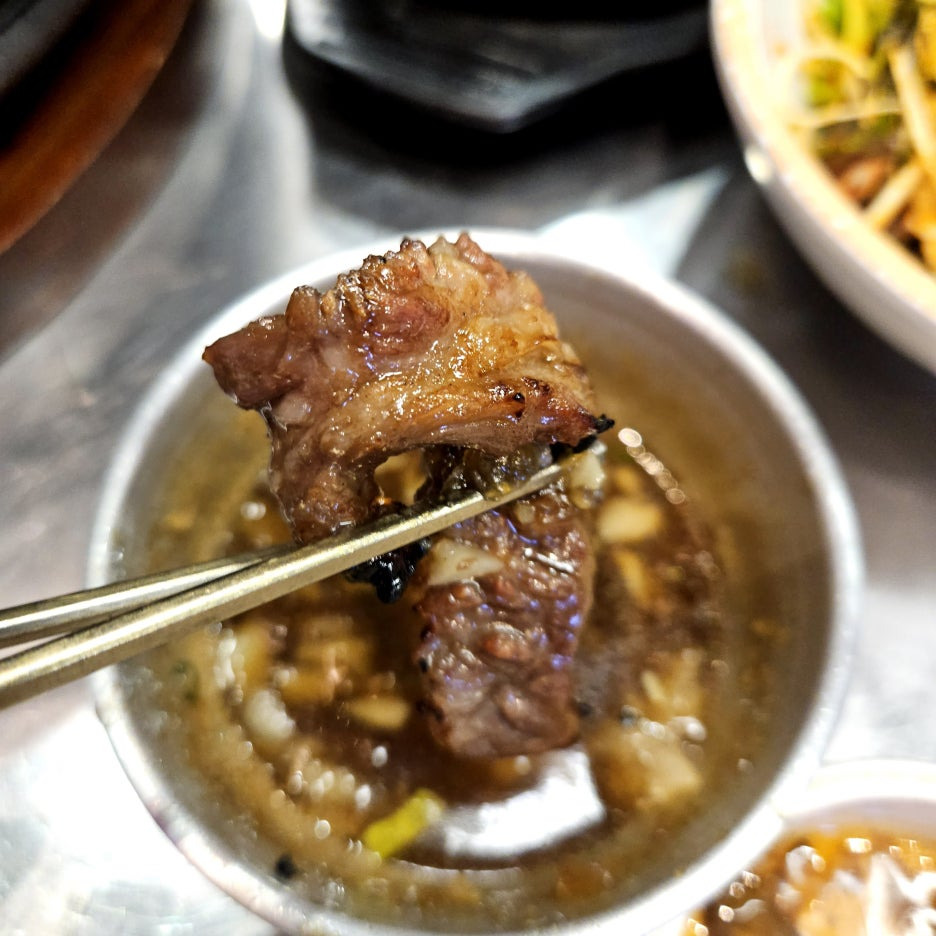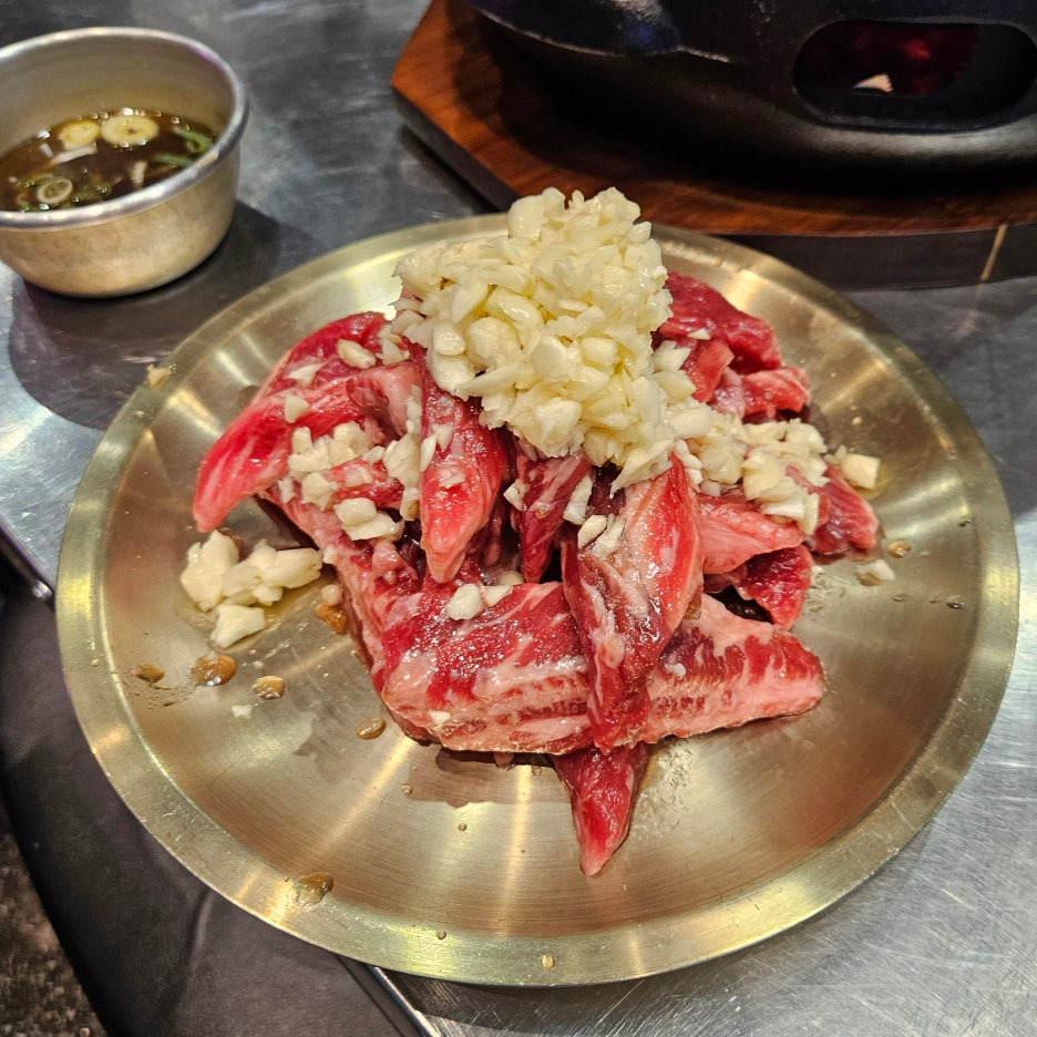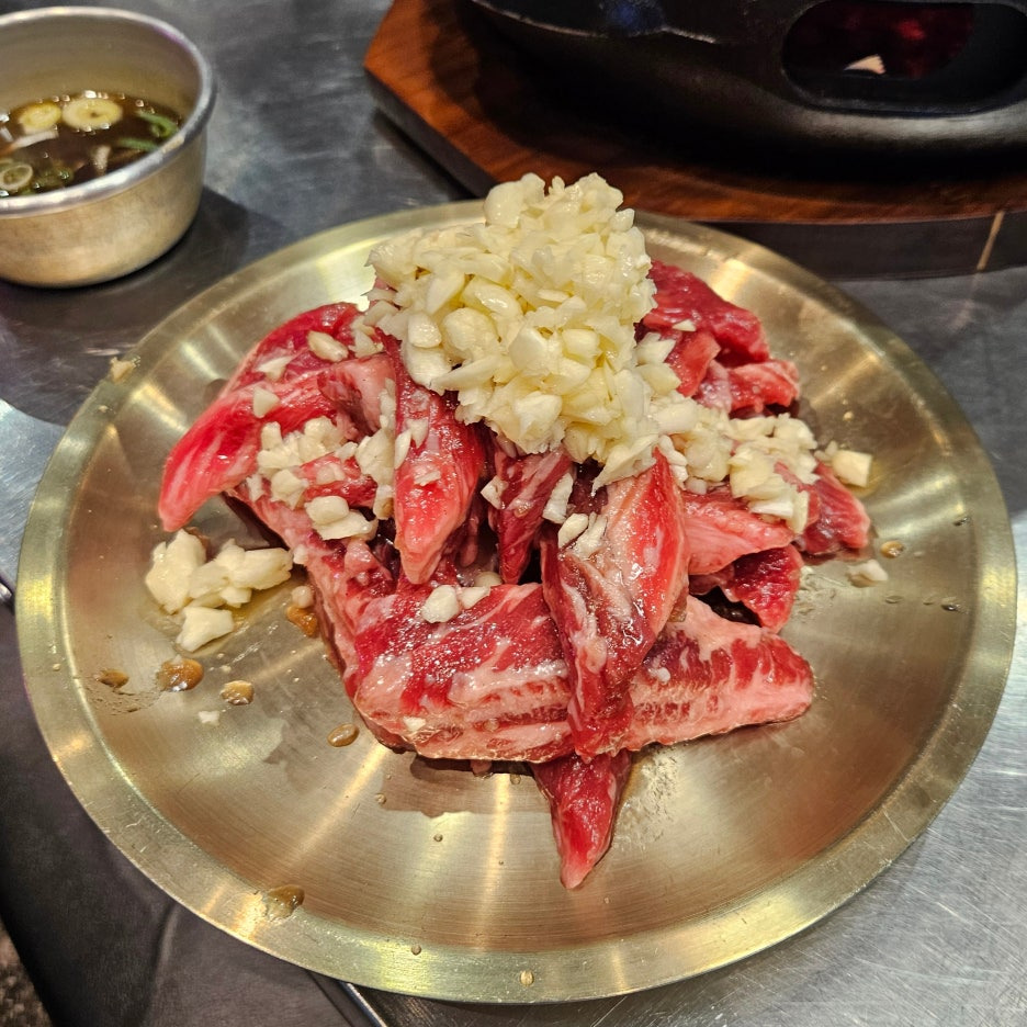 생마늘이 가득 올라간 갈빗살 주물럭이 나왔다. 고기의 마블링은 아주 대단하지는 않다. 전형적인 미국산 소고기의 모습을 하고 있다.
