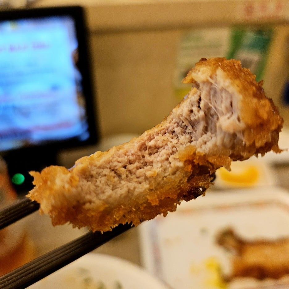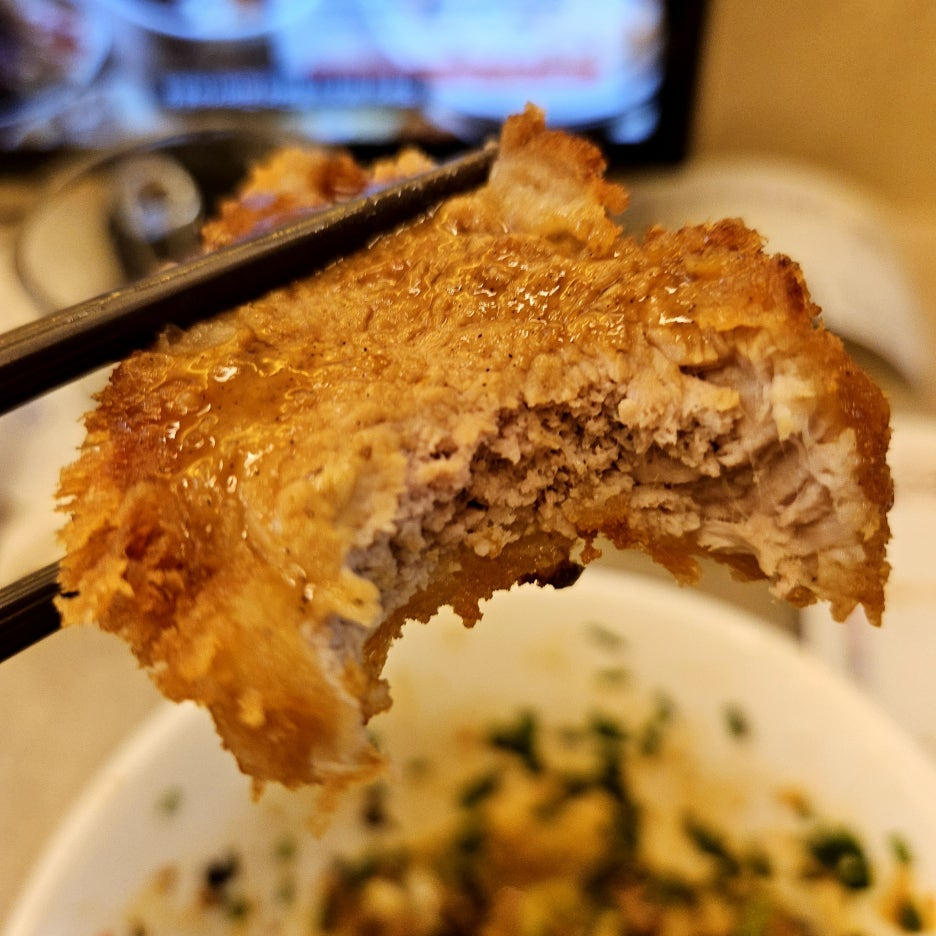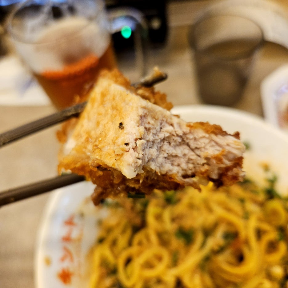 참지 못하고, 메인인 마제소바 보다 먼저 손을 댄, 안심 카츠. 튀김옷도 바삭해 보이고, 고기의 육즙도 좔좔이다.