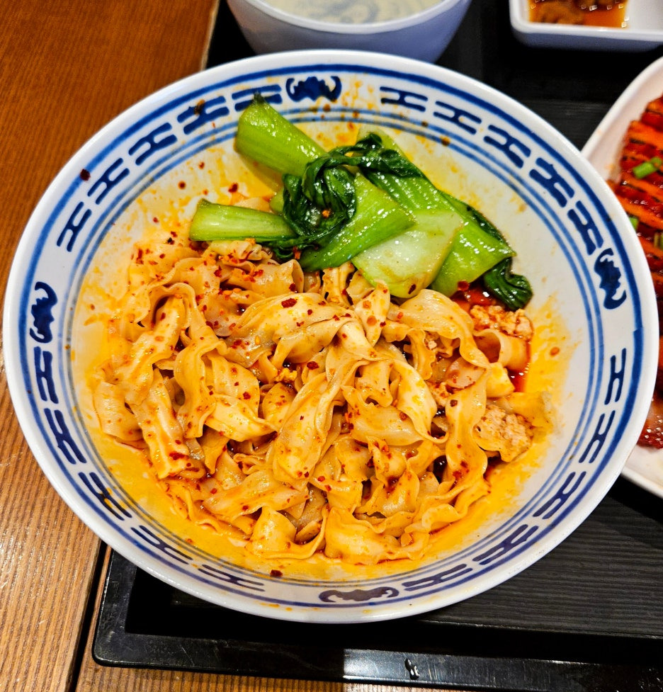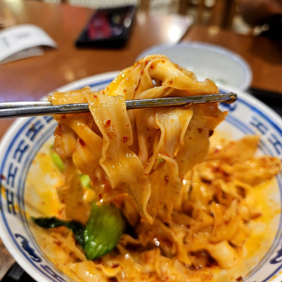도삭면 같은 모습의 면인 라유 누들. 라유를 미리 잘 비벼서 내어주었다. 매콤해 보이지만 전혀 매운맛은 없었다. 단품이라 다른 고기류는 전혀 없이 청경채만 간단하게 올라가 있었다.
