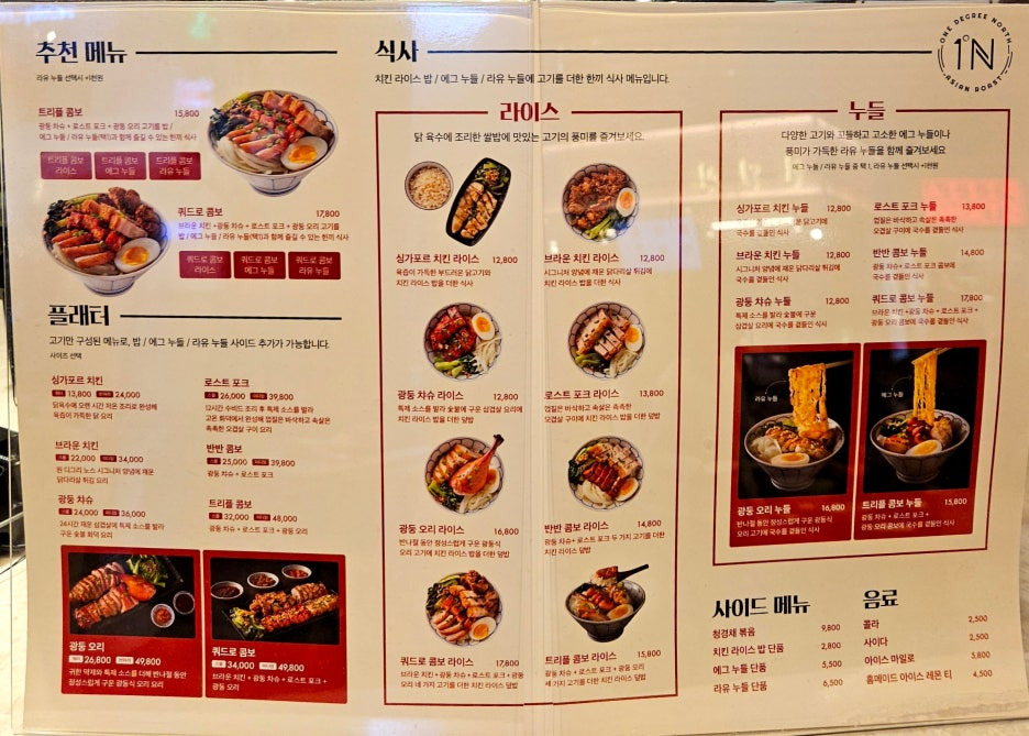 딱 알아보기 쉽게 보이는 메뉴들. 로스트 포크 등 다양한 바비큐 요리들과 면류가 있다. 싱가포르, 말레이시아, 홍콩 등지에서 쉽게 접할 수 있는 음식들이 주를 이룬다.