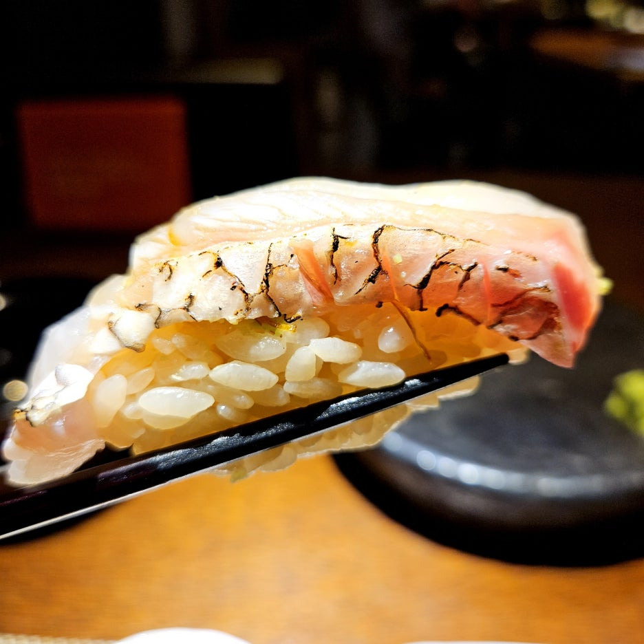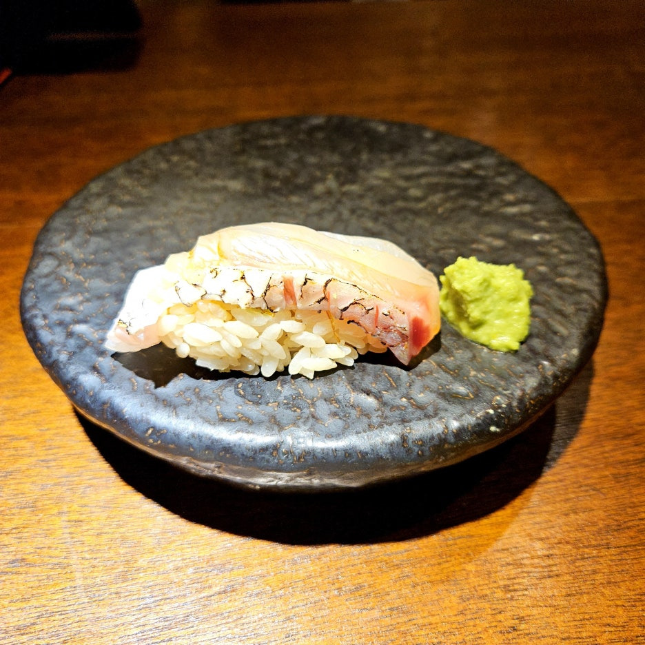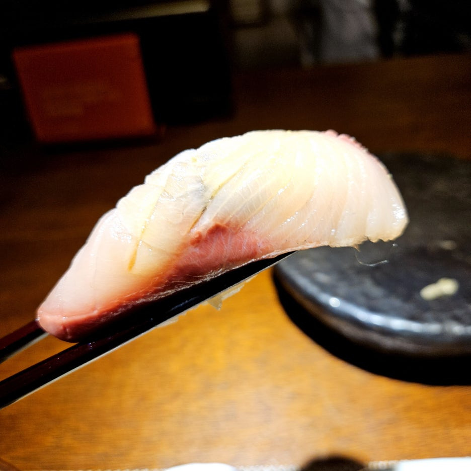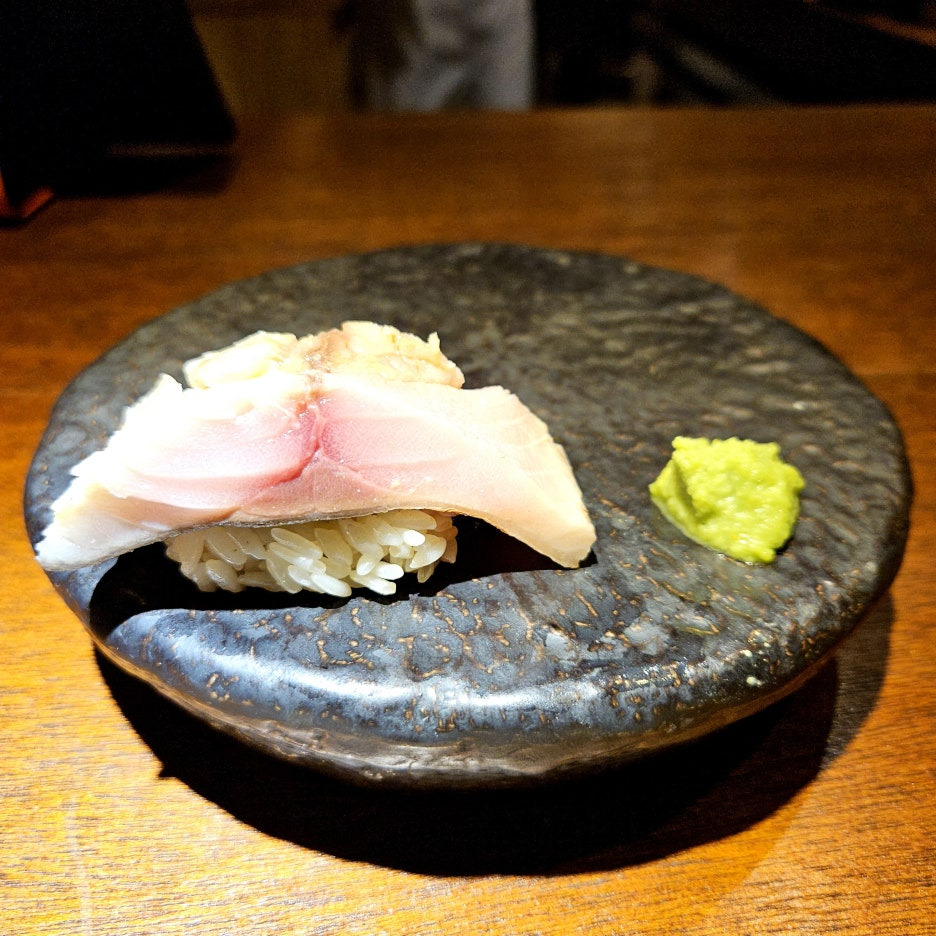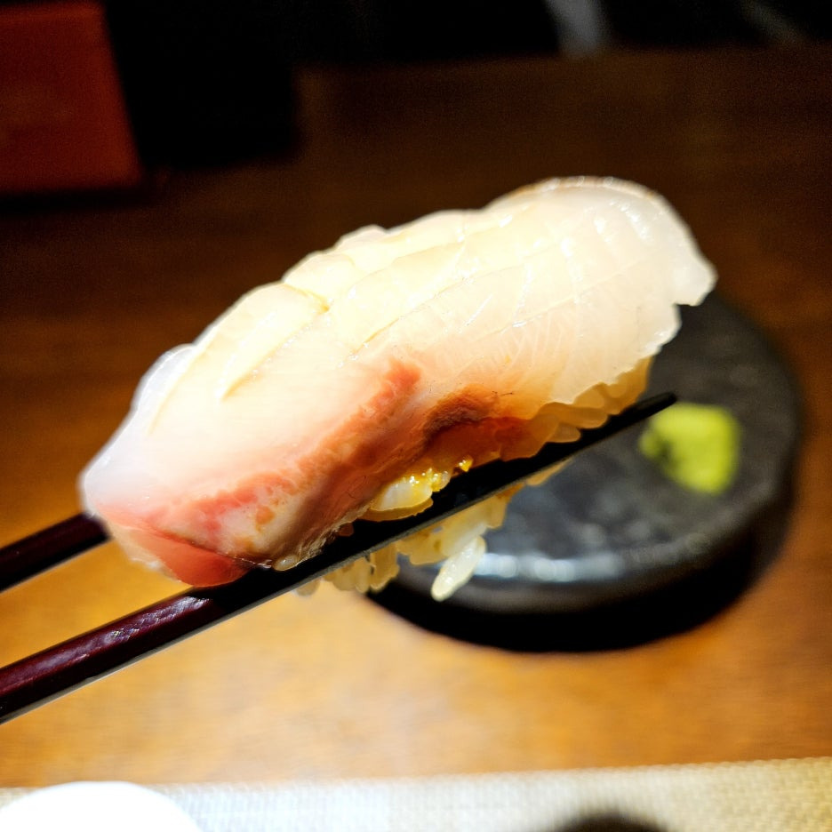 네타의 두께도 좋다. 거기에 적초를 사용한 샤리의 신 향이 딱 좋다. 흰 살 생선과는 찰떡이다. 스타트로 아주 좋았던 첫 점.