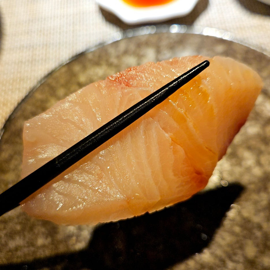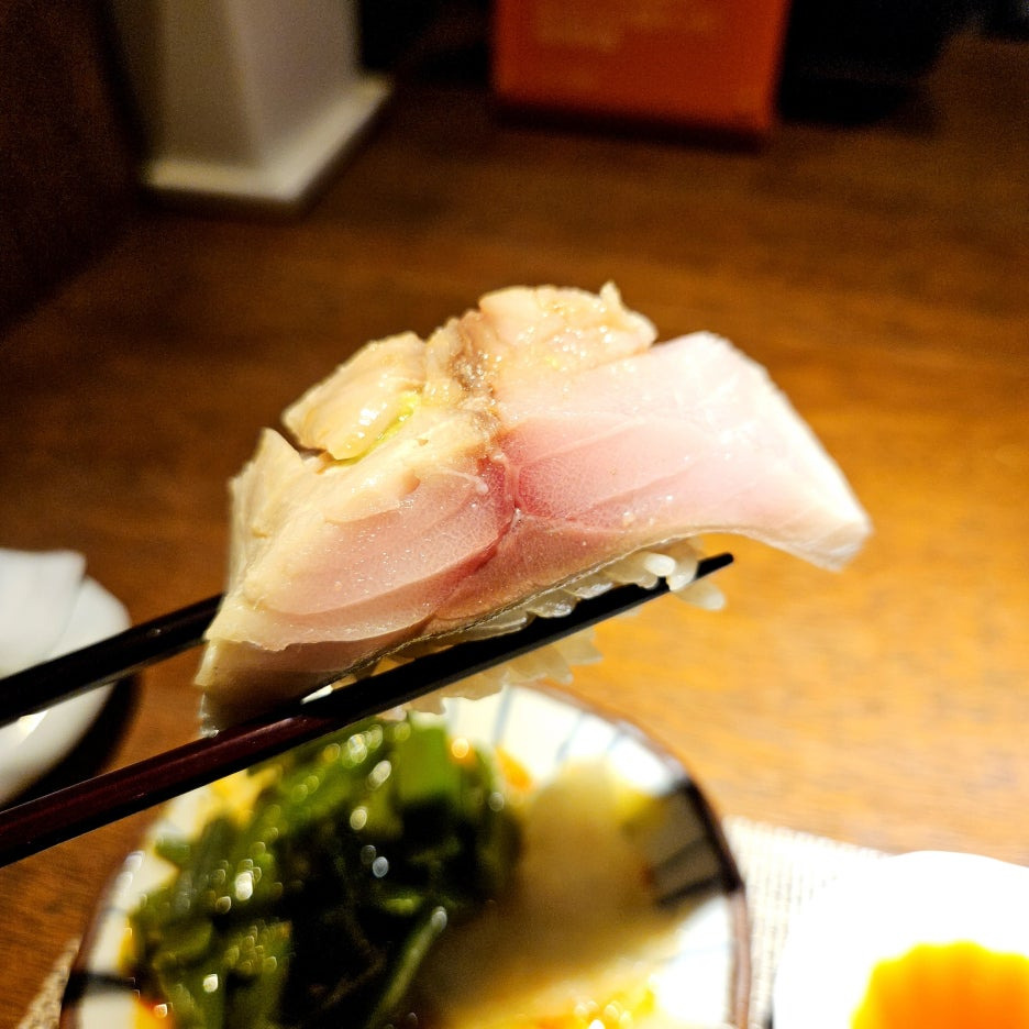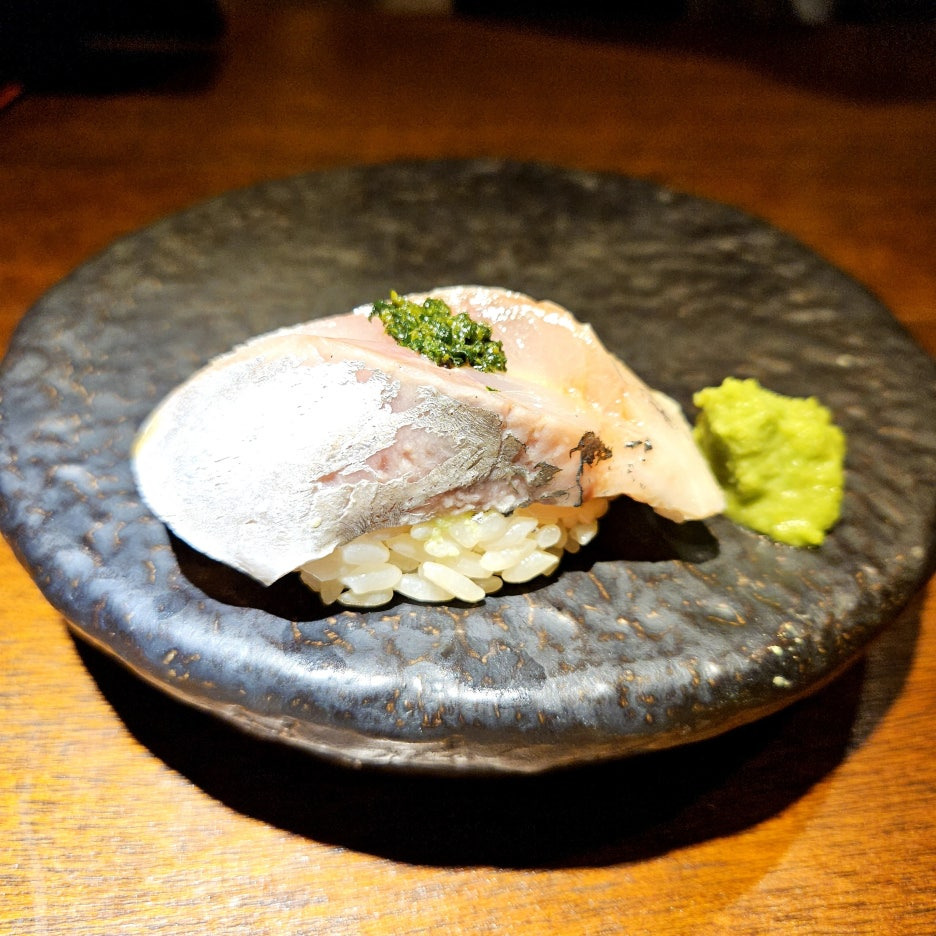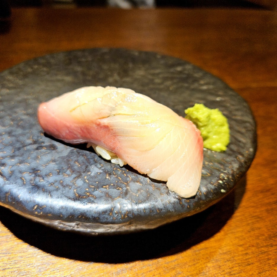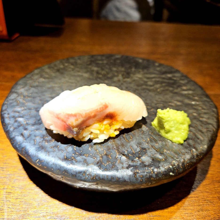 네타의 두께도 좋다. 거기에 적초를 사용한 샤리의 신 향이 딱 좋다. 흰 살 생선과는 찰떡이다. 스타트로 아주 좋았던 첫 점.