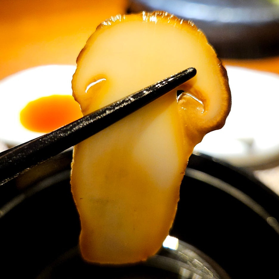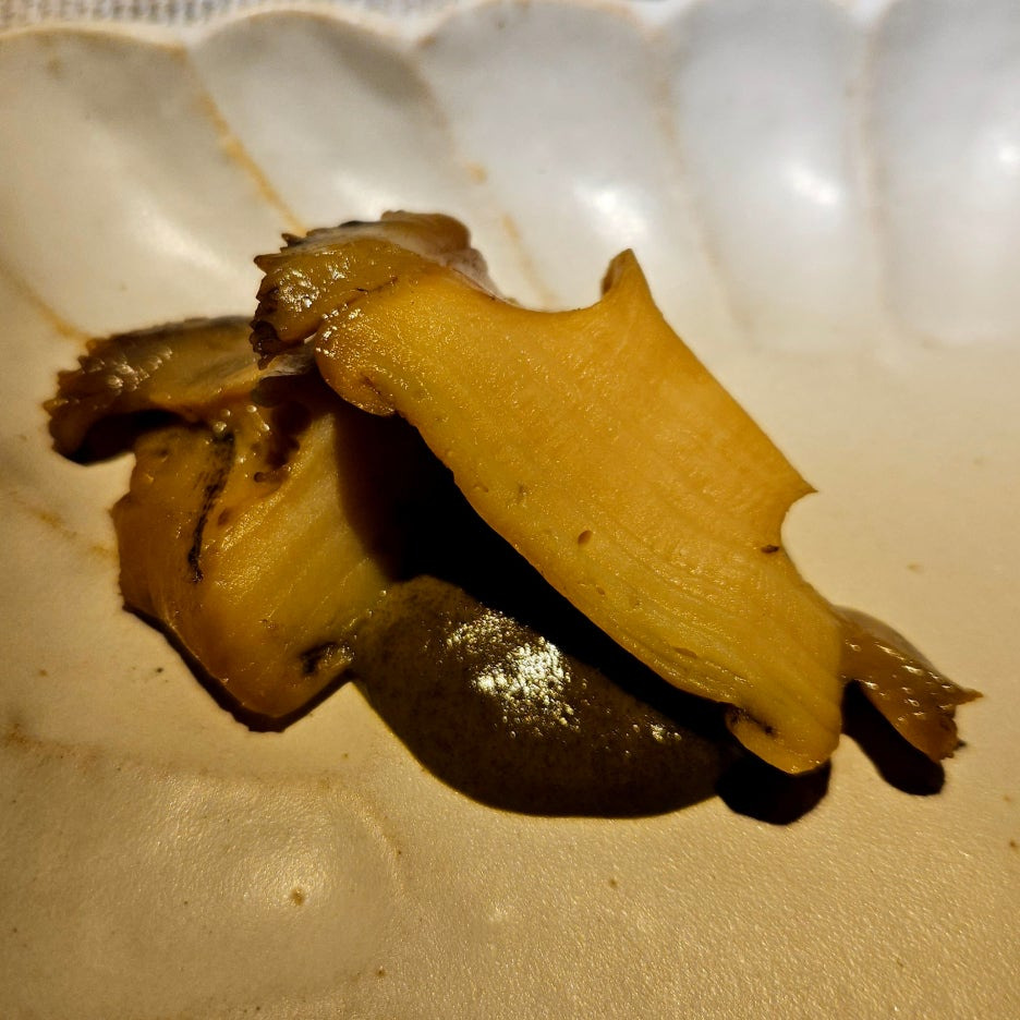 자연산 송이의 향이 상당하다. 쫄깃한 식감은 덤. 맛 자체보다는 식감과 향으로 먹는 재료.