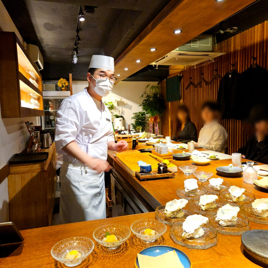 준비를 하시면서도 바쁜 와중에도 다양한 주제로 이야기를 이끄는 강석영 셰프님은 역시 편안함을 만들어 주신다. 이런 좋은 분위기에 뒤처지지 않는 맛있는 스시와 요리들로 오늘도 즐거움을 주시리라 기대하면서 받는 첫 음식.