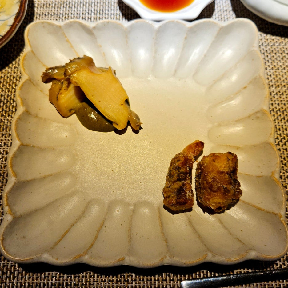 전복 내장 소스와 함께 먹는 전복은 너무나 부드럽다. 튀김옷이 아주 얇은 문어 가라아게도 훌륭하다. 이거 먹으니 차를 가져와서 술을 못 먹는 것이 너무 아쉬웠던 순간. 다음에는 차를 안 가져가야 할 듯.