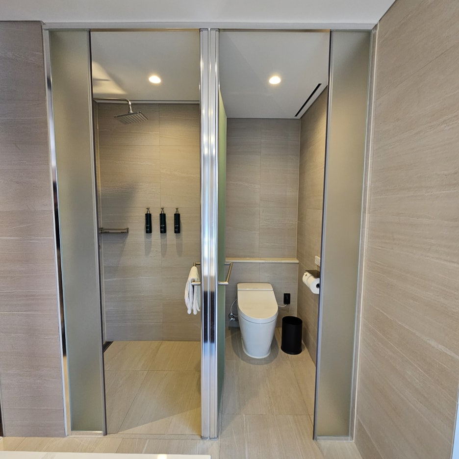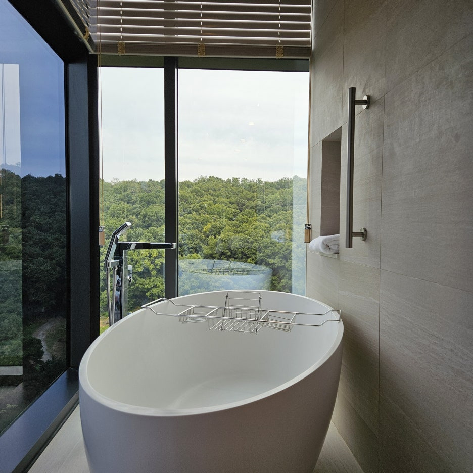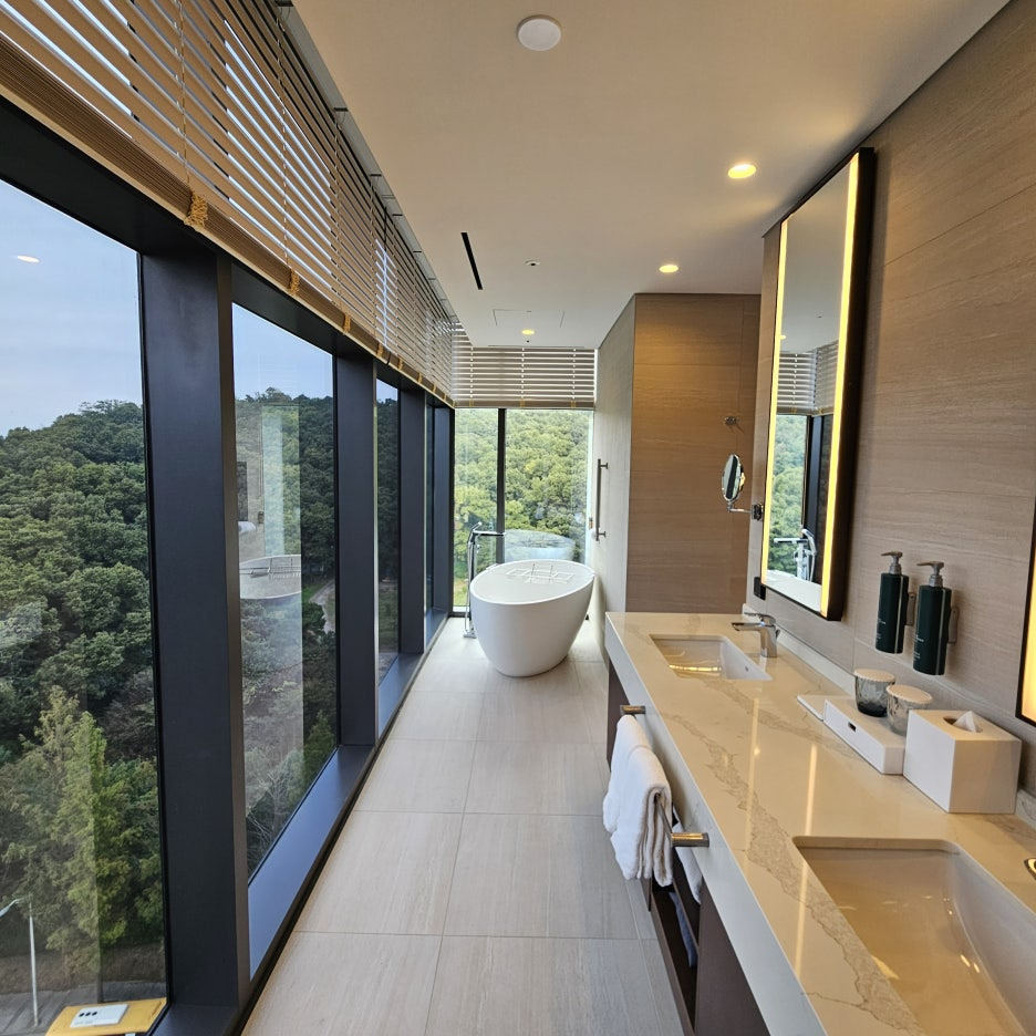기다란 형태로 되어 있는 욕실은 한쪽이 모두 통창으로 되어 있어 전망이 최고다. 물론 한쪽으로는 고속도로뷰라 그렇게 아주 멋지진 않지만, 그래도 좋다.