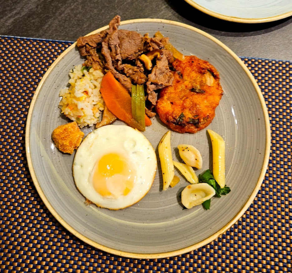 너무나 간소하게 담아온 접시. 불고기 조금, 김치전, 볶음밥, 달걀 프라이.