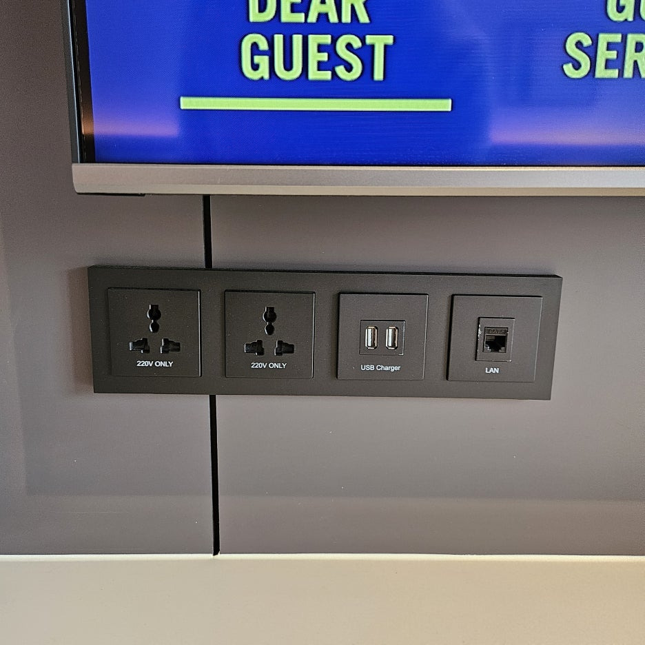 TV 밑에는 이렇게 콘센트가 있고, USB 충전도 따로 준비되어 있다.