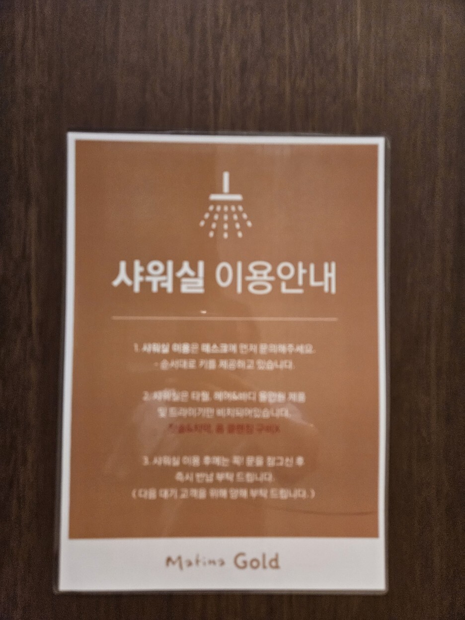 화장실과 아주 깨끗하고, 샤워룸도 3개 정도 있다. 그런데 우리 같이 한국에서 출발하는 사람들은 아무래도 샤워룸을 사용할 일은 전혀 없을 것 같다.