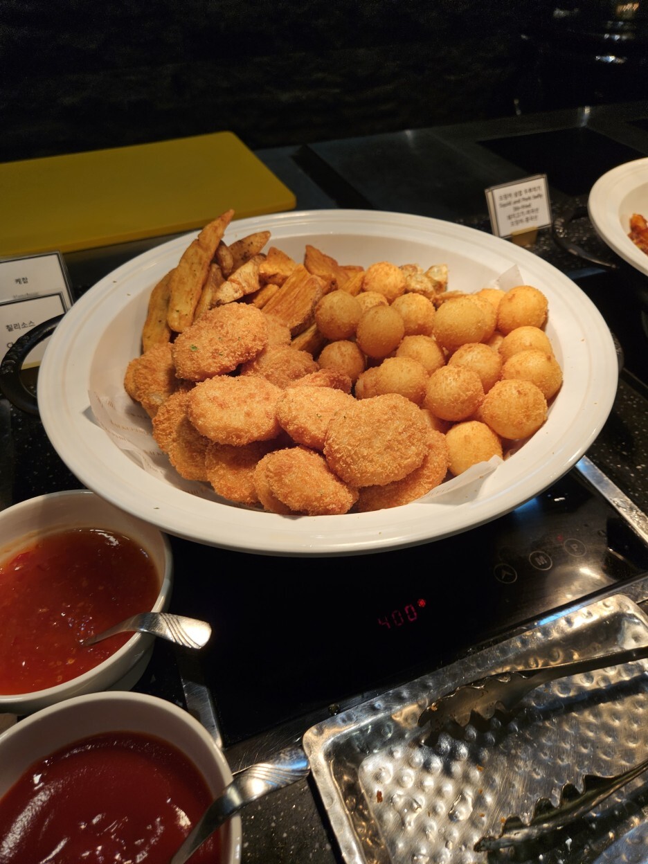 이제 메인급인 핫푸드들. 특히 모둠튀김류가 좋았다. 감자크로켓, 튀긴 만두, 치즈볼. 그리고 시뻘건 기름기가 좔좔 흐르던 오징어 삼겹 두루치기. 사실 오징어는 거의 보이지 않았다. 누군가가 오징어만 쓸어간 걸까?