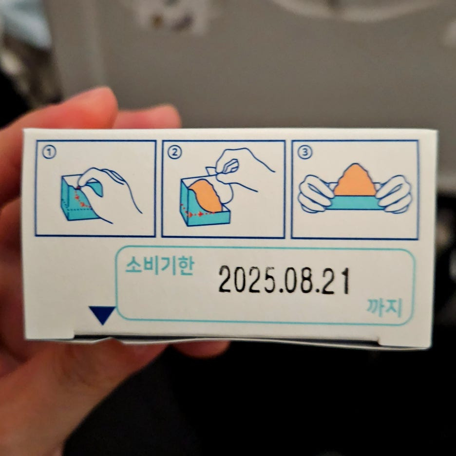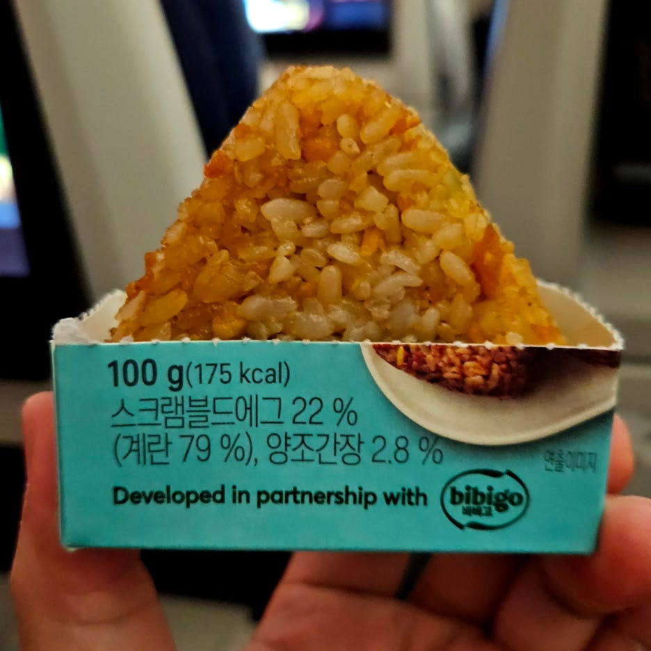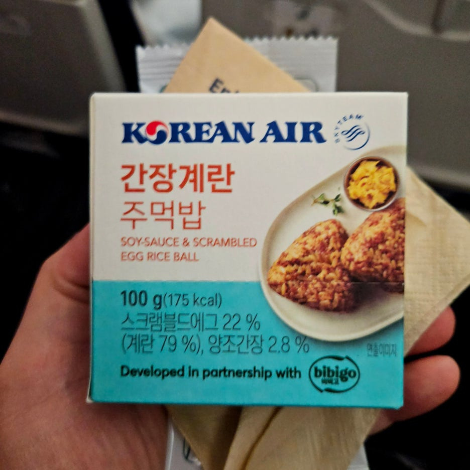기내식을 다 먹고 약 4시간 후 제공된 주먹밥. 한국시간으로 밤 10시 55분쯤 나왔다. 그냥 과일 바나나와 주먹밥을 고를 수 있었는데, 난 주먹밥으로.