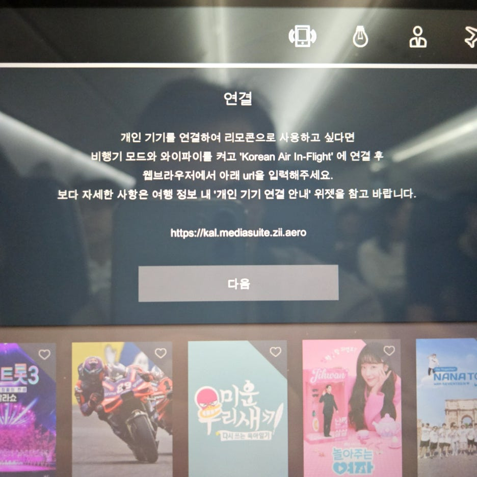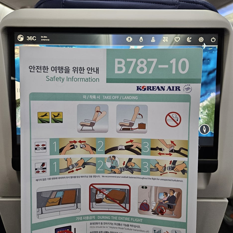 항공기 탑승 직전에 보통 신문이 놓여 있던 곳에 이어폰도 함께 놓여 있었는데, 꼭 가져가시길 바란다. 요즘은 다들 무선 블루투스 이어폰들을 사용하다 보니, 개인용 이어폰은 연결할 수 없을 수도 있다. 물론, 승무원분께 따로 요청을 하니 가져다주긴 했다.