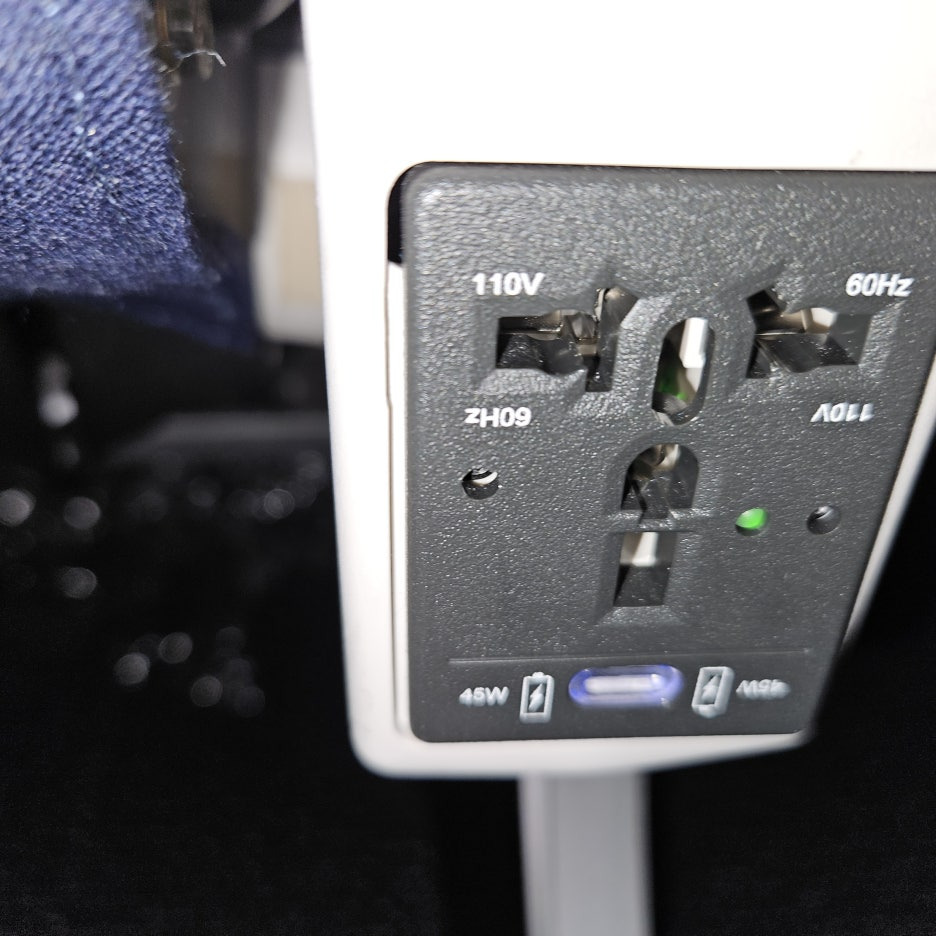 좌석 아래쪽에 있어서 사진 찍기 너무 힘들었던, 전기 콘센트. 110v를 지원하는 것 같다. 요즘 충전기는 다 프리 볼트이니 사용에는 문제없었다. 그리고 아래쪽에는 무려 45w의 USB-C 타입 충전도 가능했다. 고속 충전 가능하다.