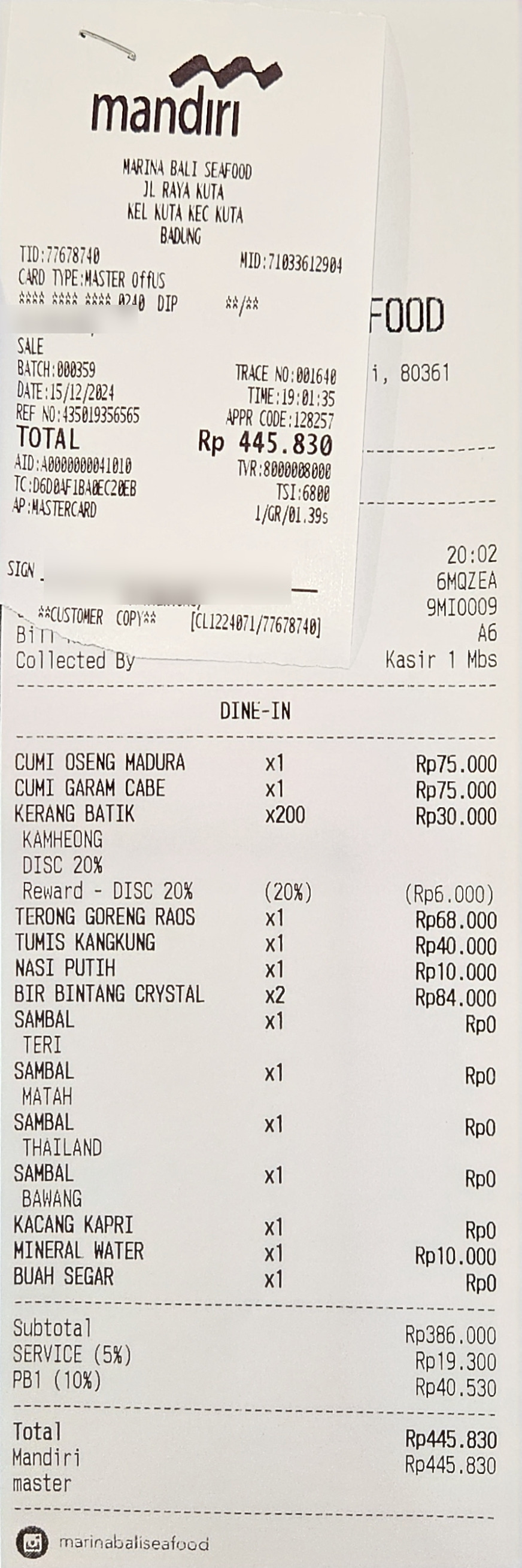 이렇게 푸짐하게 먹고, 445,830루피아.