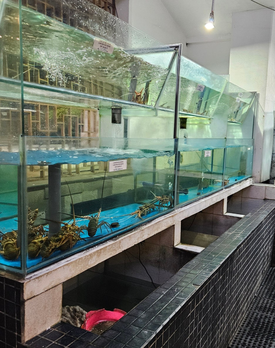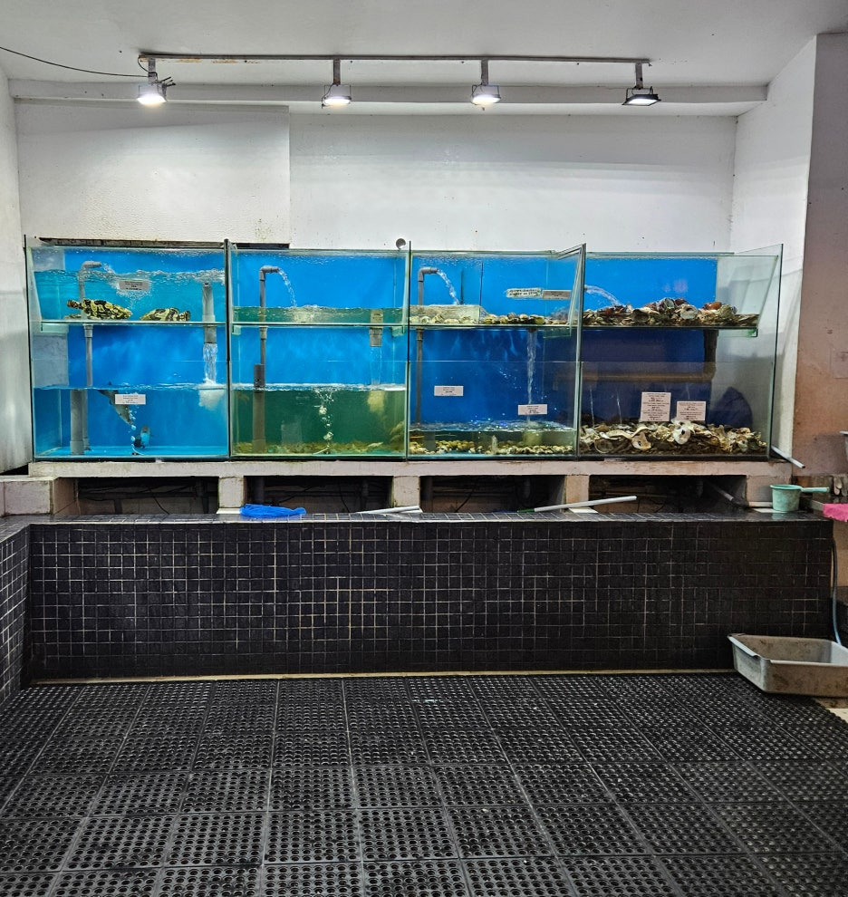 왼쪽으로는 수조에 여러 해산물들이 헤엄을 치고 있다. 많은 양은 아니었지만, 다양한 종류가 있었다.