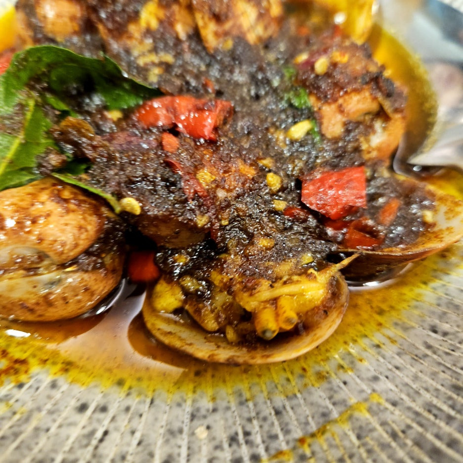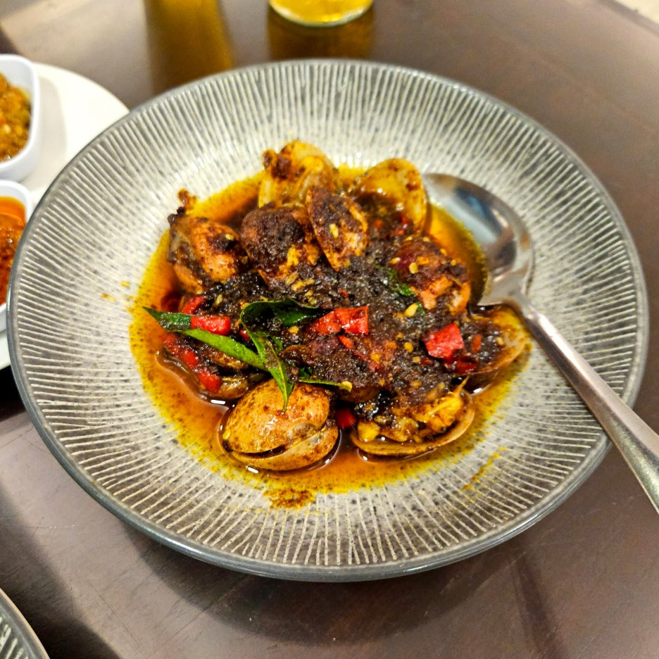 우리나라 모시조개 같은 조개를 기름으로 볶고 그 위에 삼발이 올라간 느낌이다.