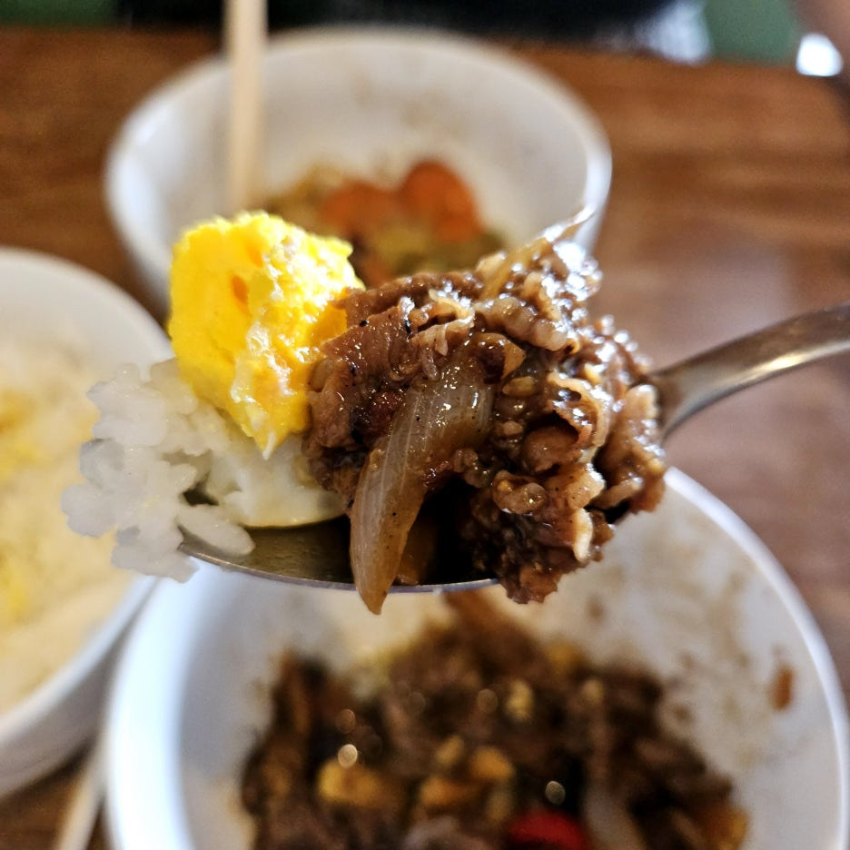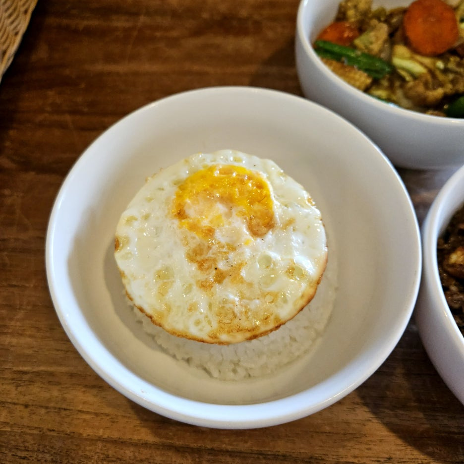 시간이 조금 걸릴 거라고 했던 공깃밥. 오픈한 지 얼마 되지 않아서 밥을 미리 해두지 않았던 듯. 추가한 달걀 프라이와 함께.