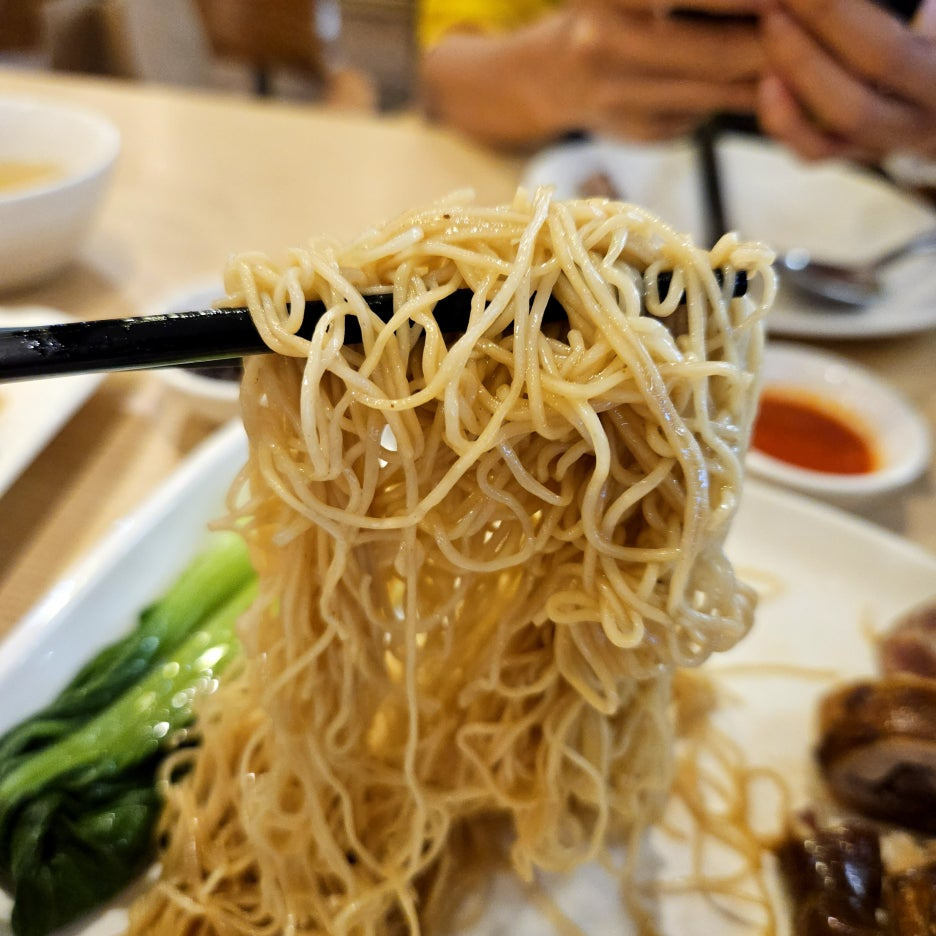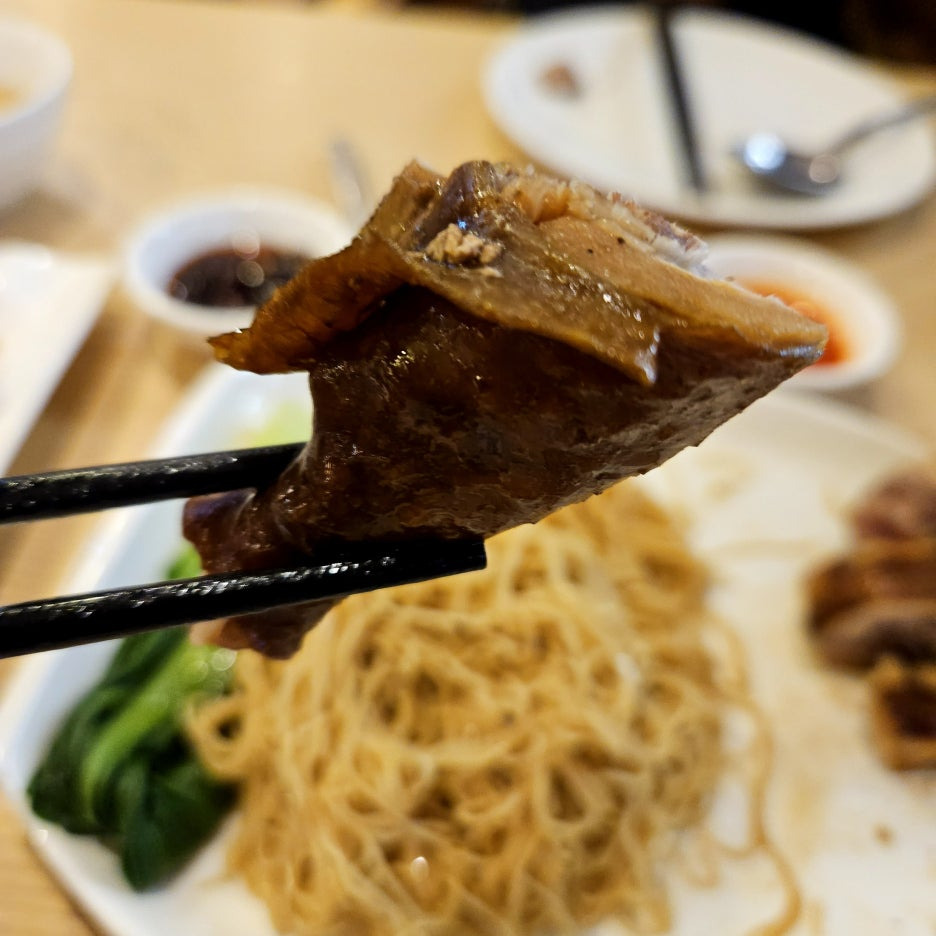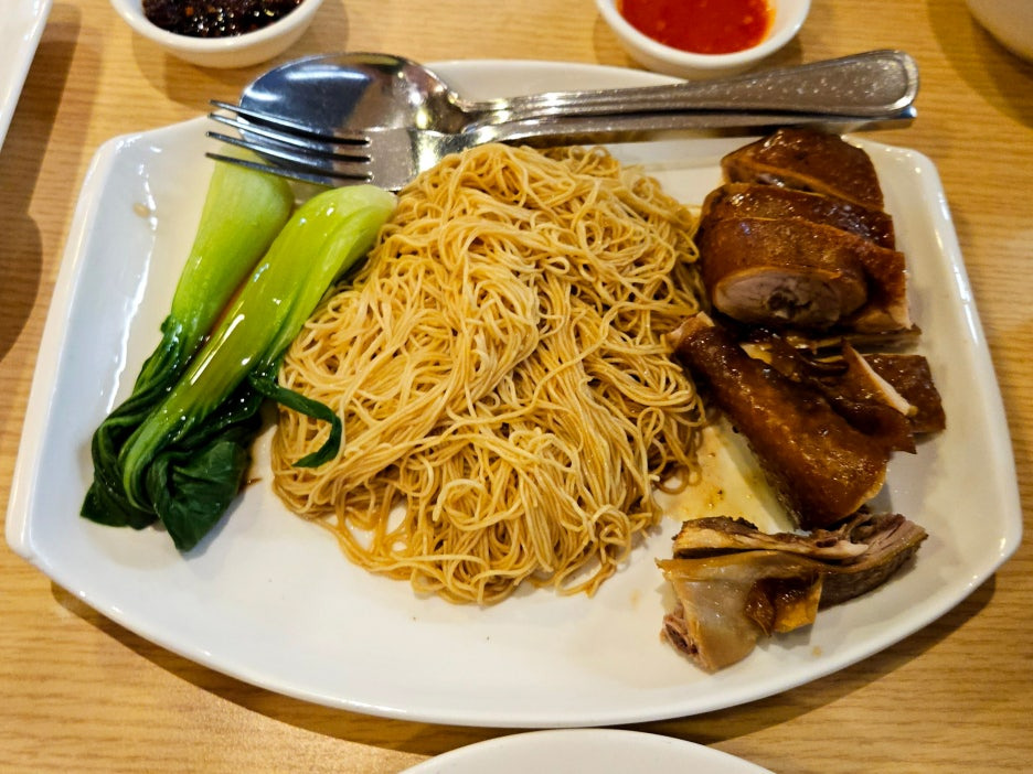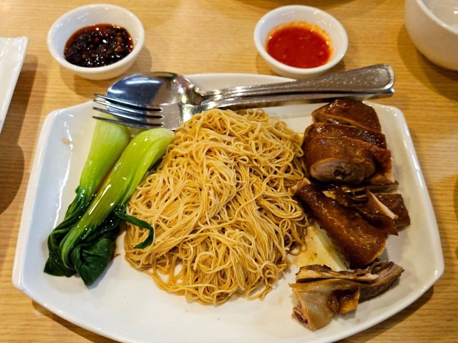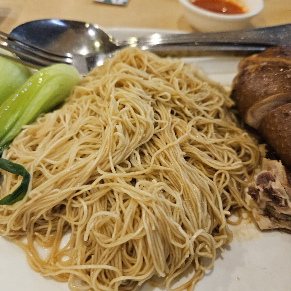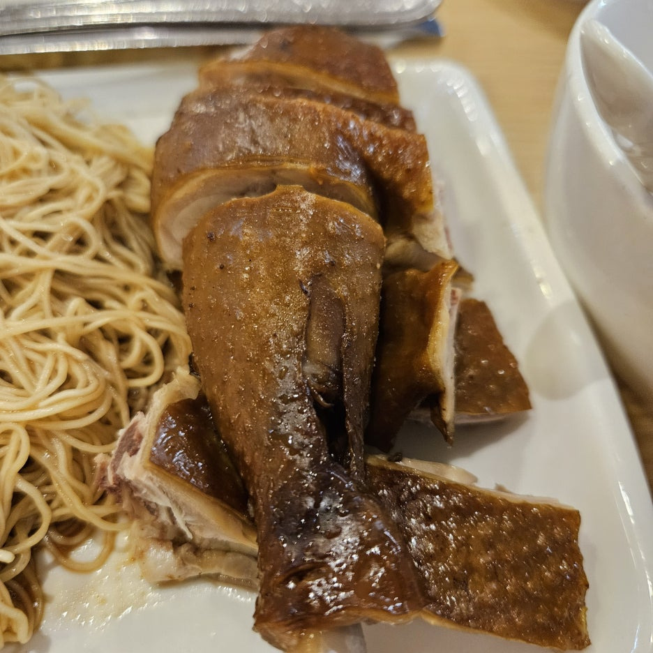 오늘의 메인 메뉴. 한국에 있는 딤섬집인 딤딤섬에 가면 먹을 수 있는 로미엔과 동일하다. 특제 양념이 발라진 닭 다리 하나와 홍콩식 면을 소스에 비벼 먹는 느낌.