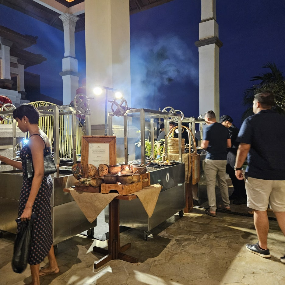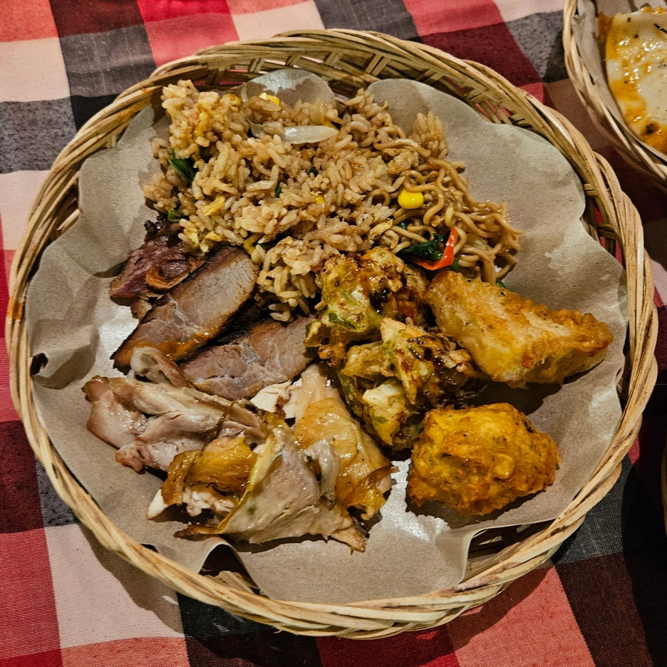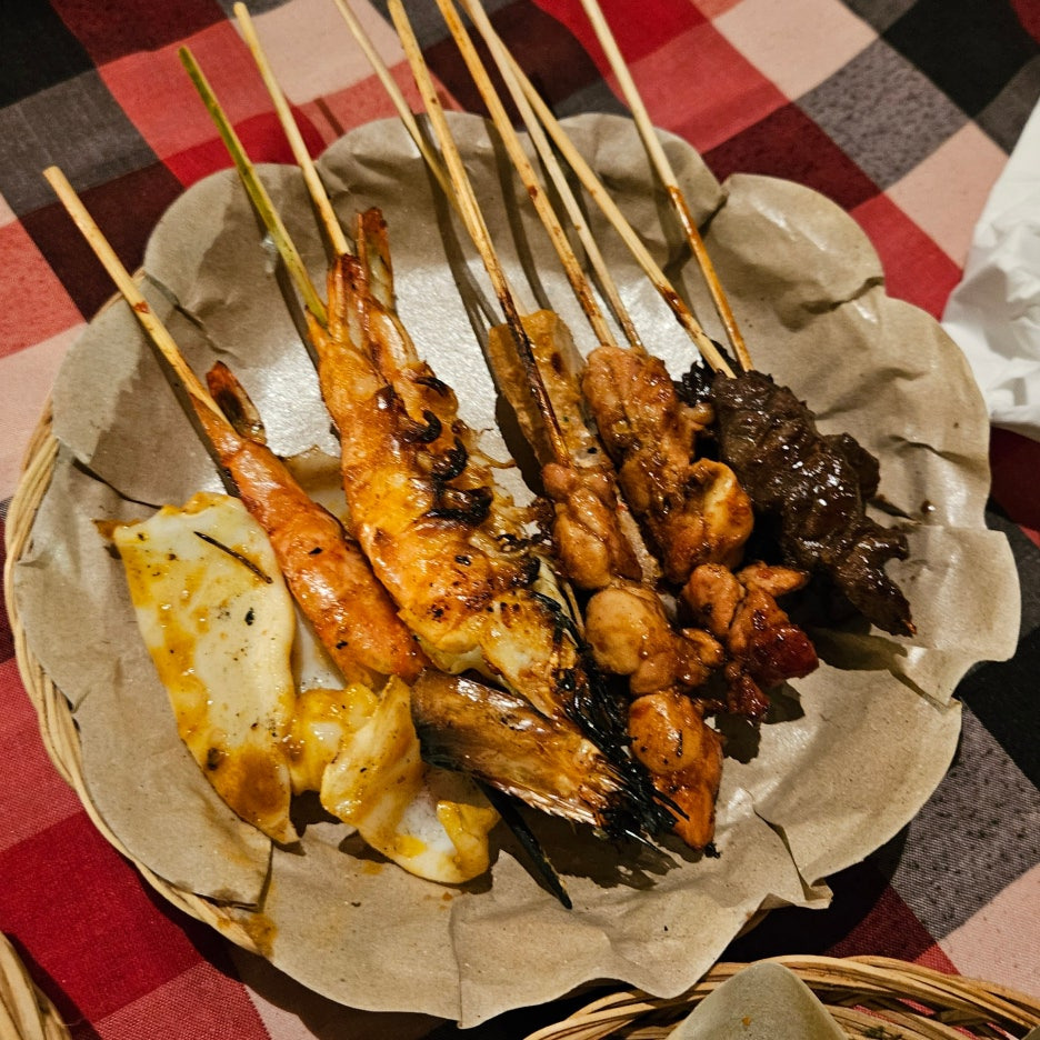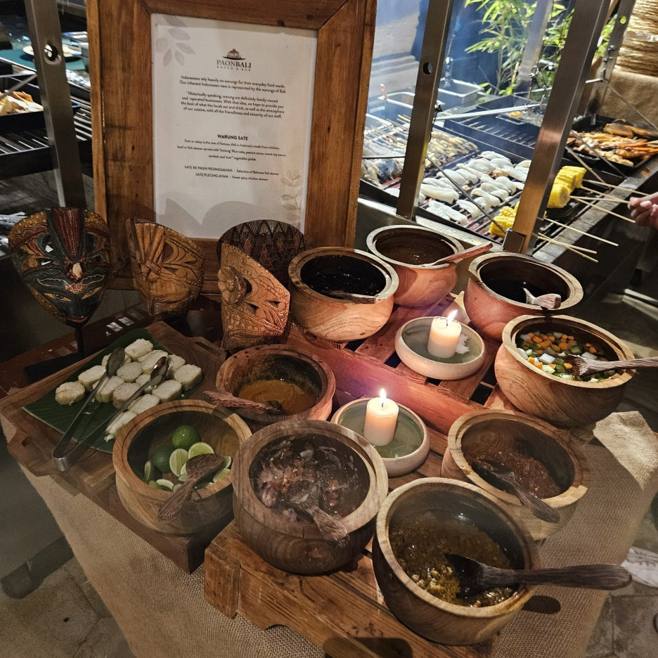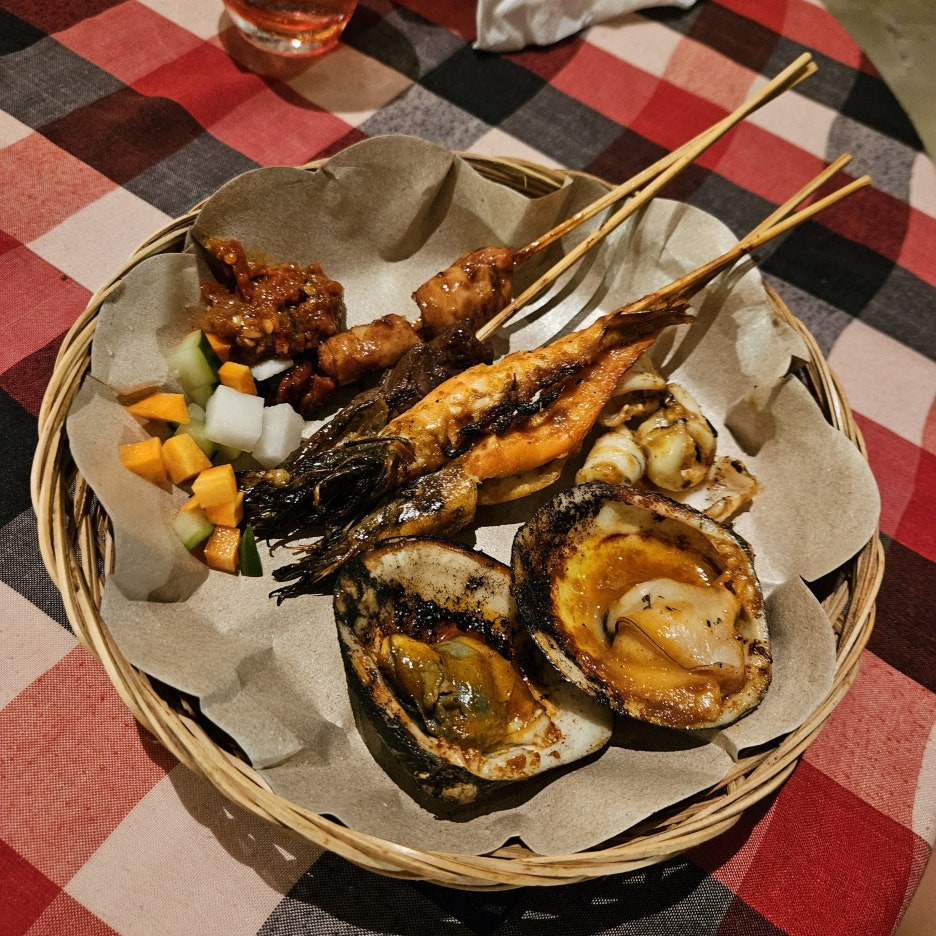 뷔페에서 먹는 그릇도 일반 접시가 아닌, 발리의 로컬 식당에서 볼 수 있었던 형태이다. 분위는 확실히 잘 잡아준다. 첫 접시는 새우, 오징어 구이, 각종 사테. 바로 숯에서 구워 온 것이라 불 향도 나고, 양념도 좋고 맛있다. 훌륭하다.