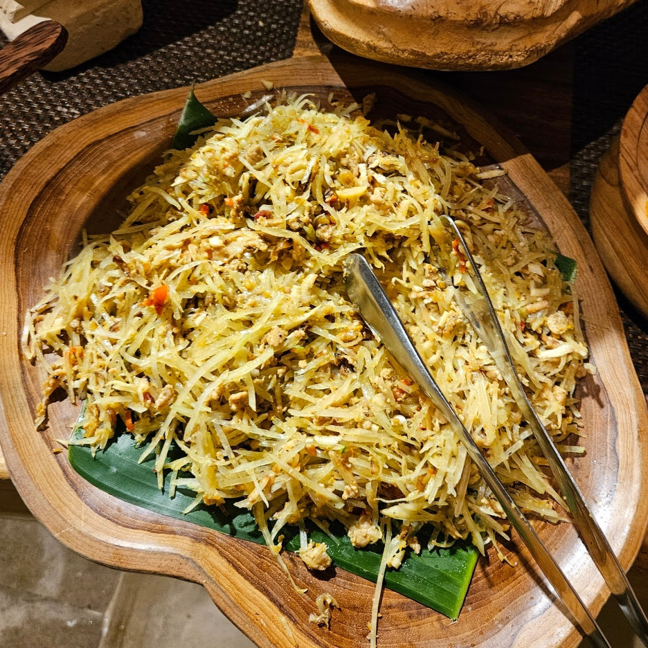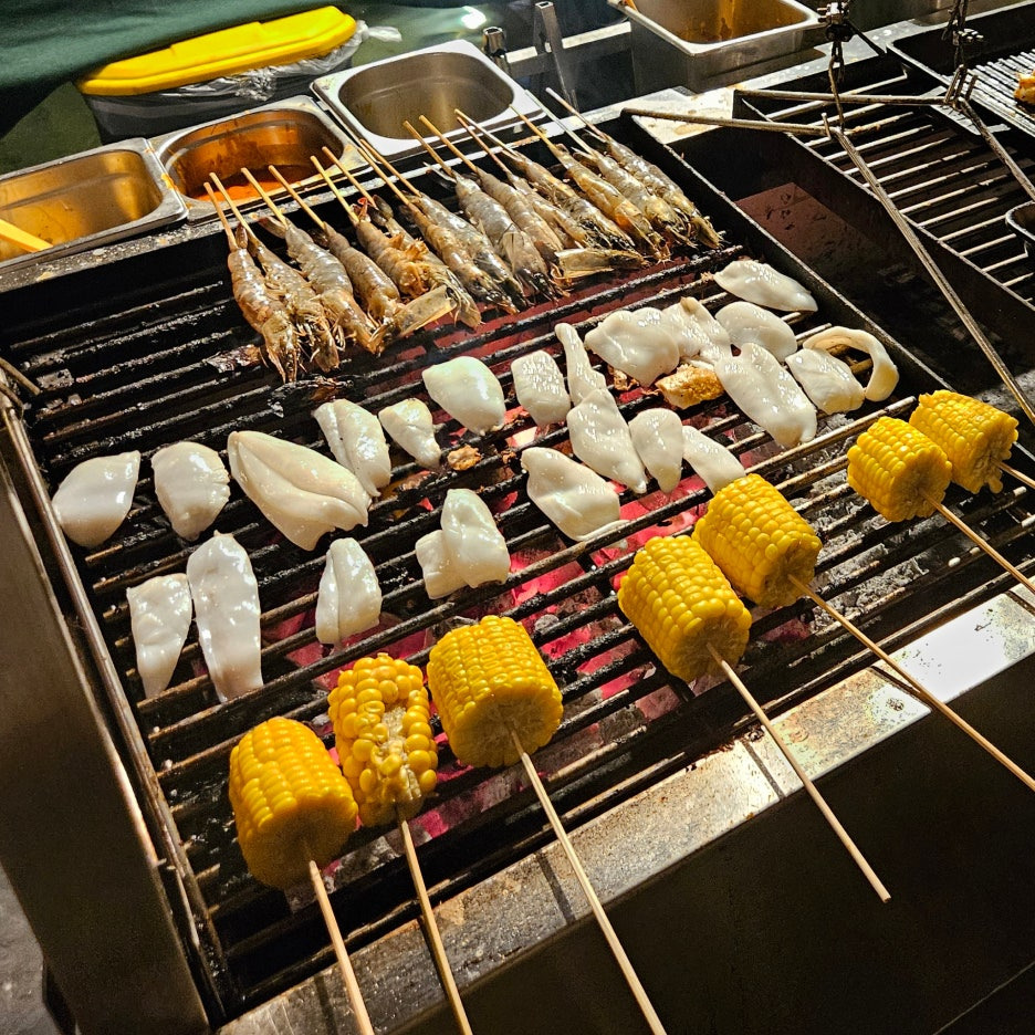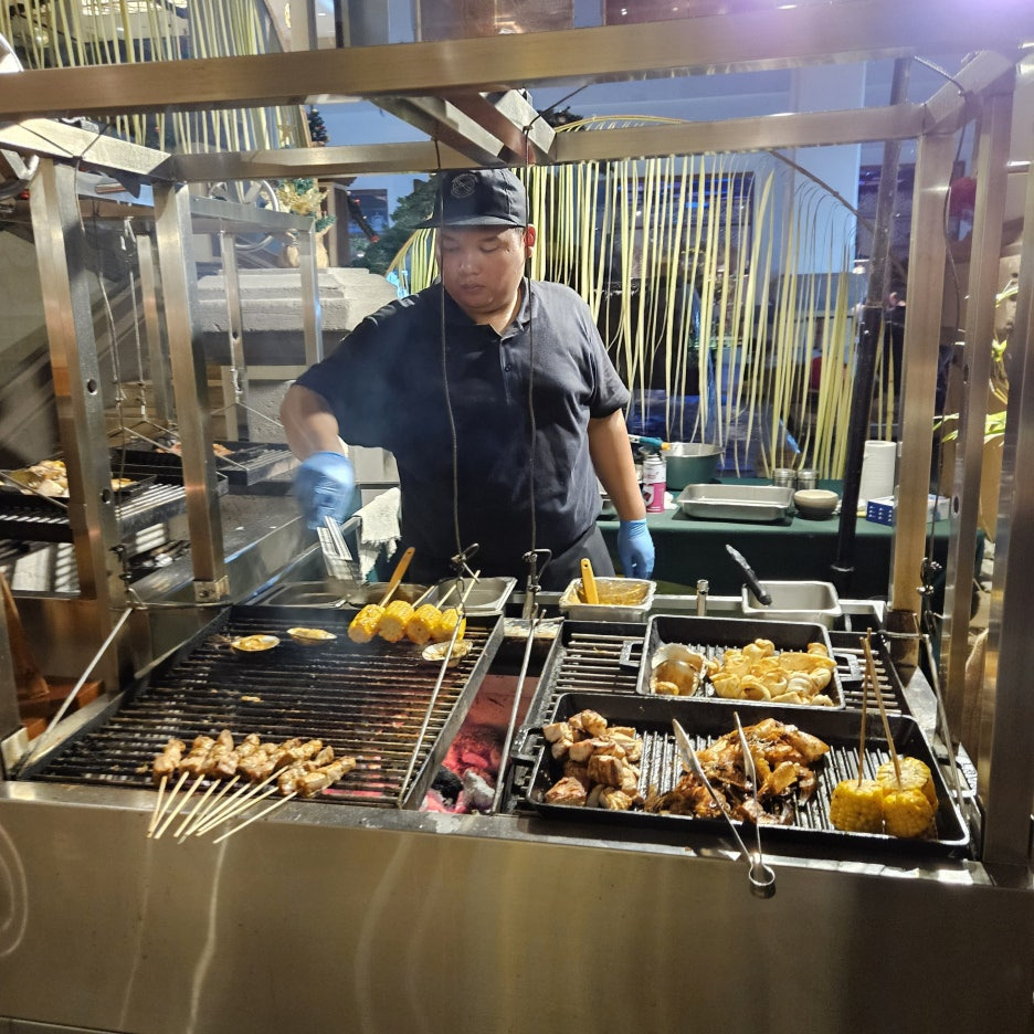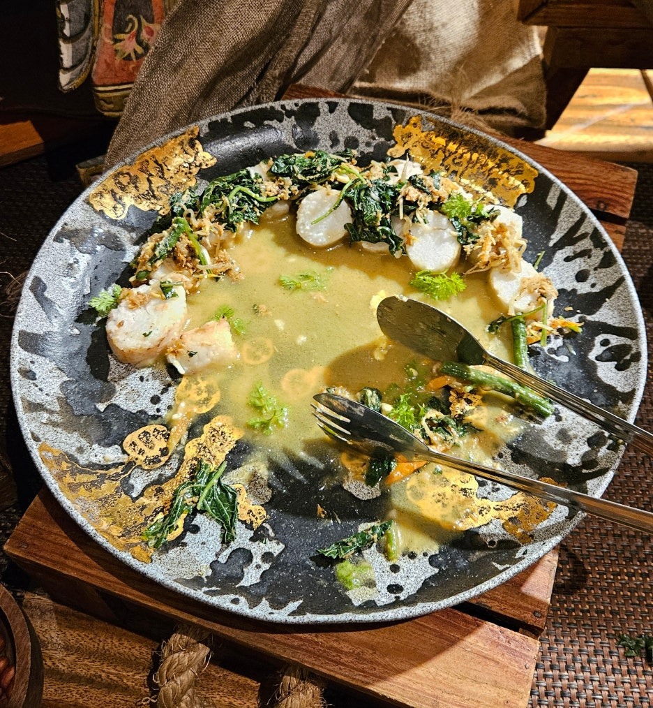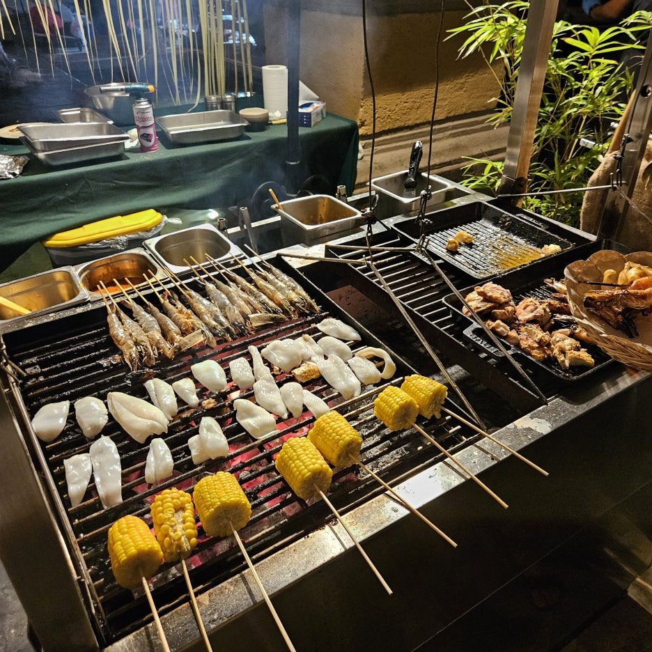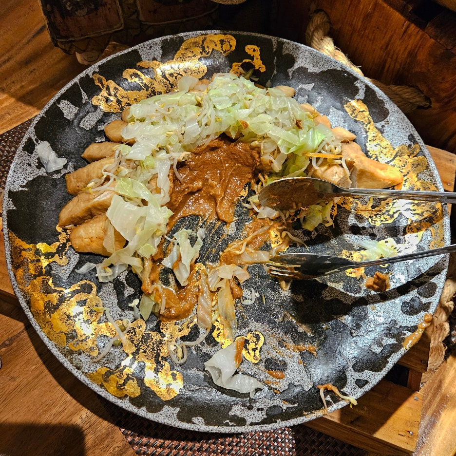 뷔페에서 먹는 그릇도 일반 접시가 아닌, 발리의 로컬 식당에서 볼 수 있었던 형태이다. 분위는 확실히 잘 잡아준다. 첫 접시는 새우, 오징어 구이, 각종 사테. 바로 숯에서 구워 온 것이라 불 향도 나고, 양념도 좋고 맛있다. 훌륭하다.