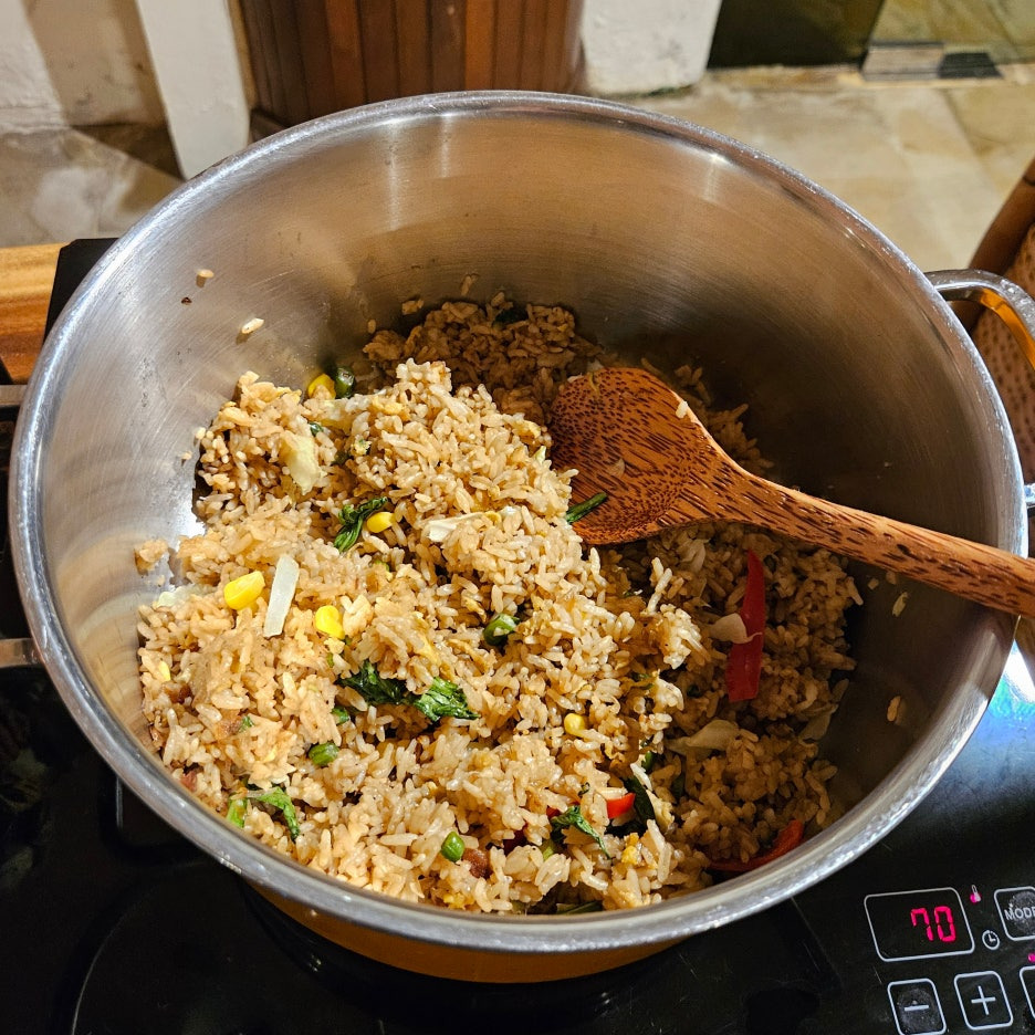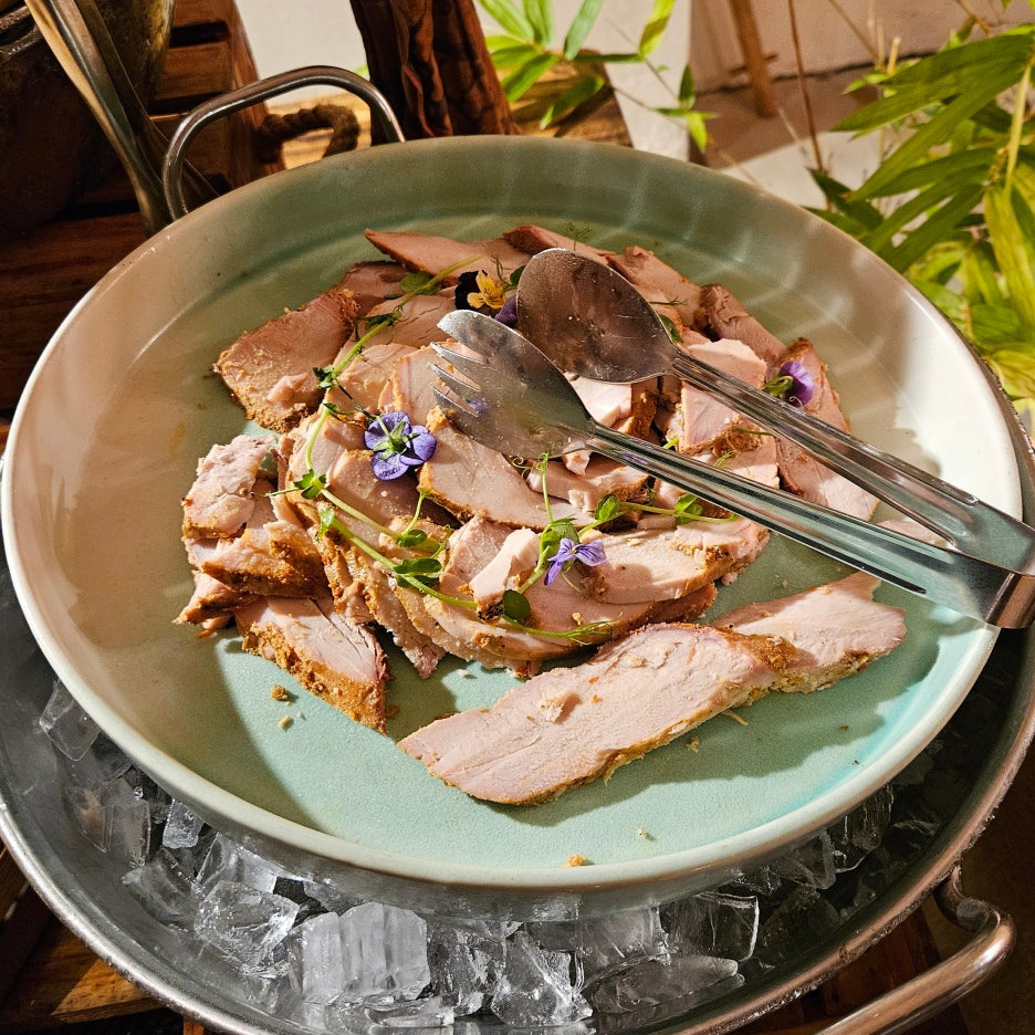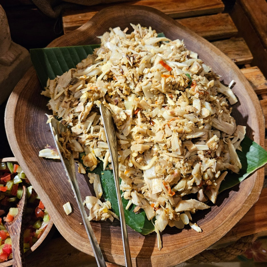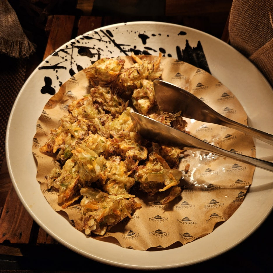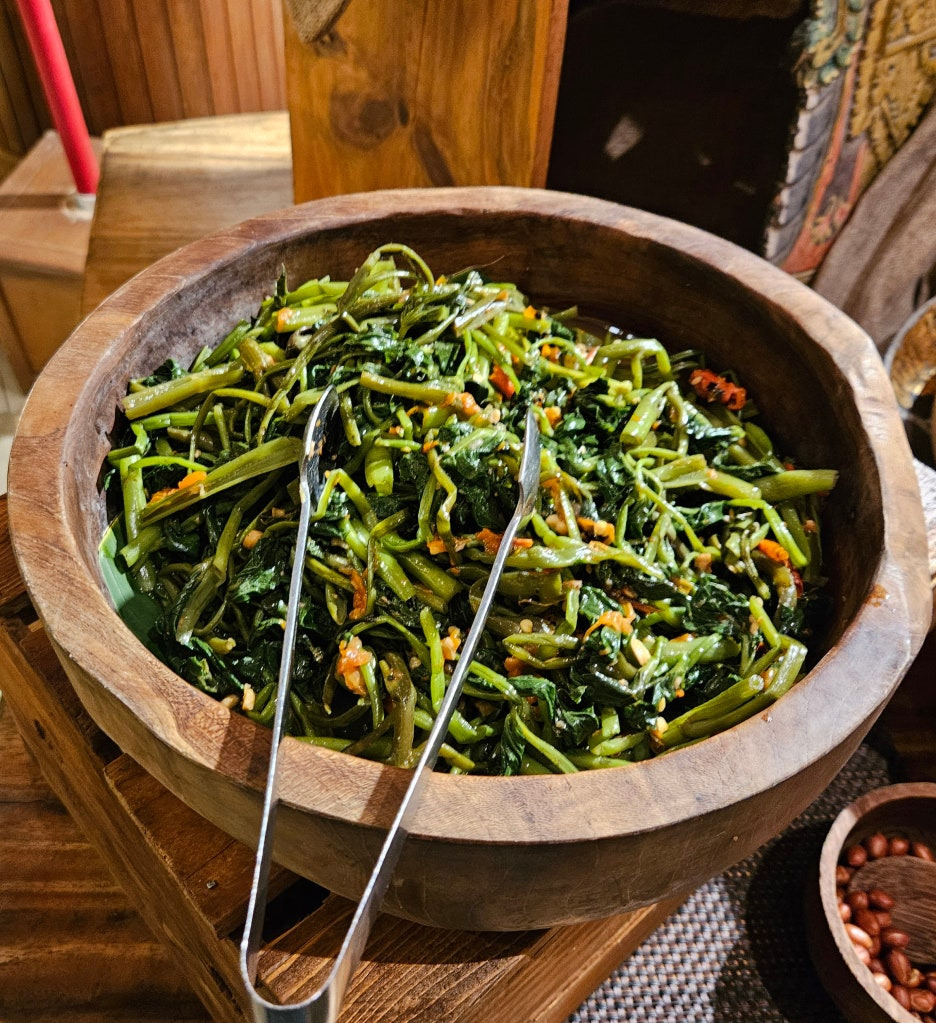 뷔페에서 먹는 그릇도 일반 접시가 아닌, 발리의 로컬 식당에서 볼 수 있었던 형태이다. 분위는 확실히 잘 잡아준다. 첫 접시는 새우, 오징어 구이, 각종 사테. 바로 숯에서 구워 온 것이라 불 향도 나고, 양념도 좋고 맛있다. 훌륭하다.