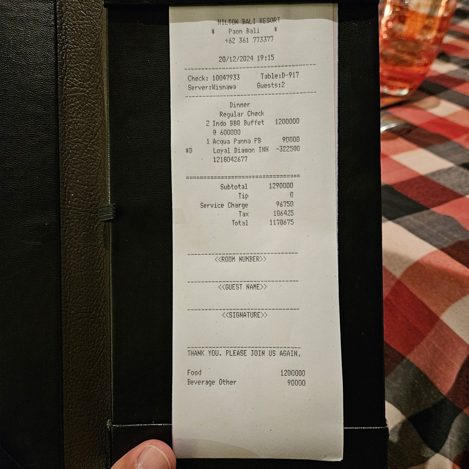 맛있게 잘 먹었던 힐튼 발리 뷔페. 1인당 600K 루피아로 가격이 저렴하진 않다. 거기에 10%의 서비스 차지, 11%의 세금. 총 21%가 추가된다. 유의하시길.. 우리는 힐튼 아너스 할인을 받았다.