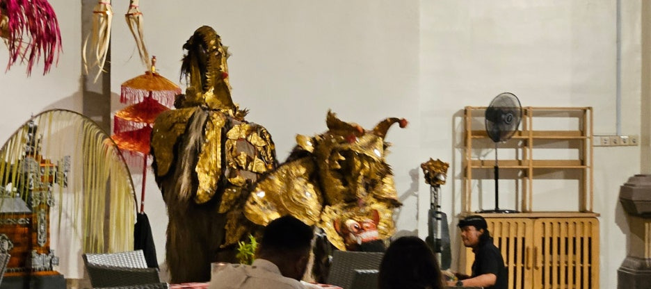 사진상으로 잘 알아보기가 힘들긴 한데, 나중에는 이렇게 코끼리였나 어떠한 큰 동물을 나타내는 큰 탈을 쓰고 진행하는 공연도 있었다. 여자분 두 분과 함께 춤을 추는데, 뭔가 스토리가 있는 듯했다. 먹느라 자세히 보지 않아서 잘은 모르겠다.