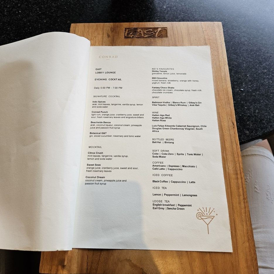 이브닝 칵테일로 왔다고 하니, 메뉴를 제공해 주었다. 스위트 라운지와는 거의 비슷하지만 조금 차이가 있었다. 특히 이스트 로비 라운지는 어린이들도 방문이 가능하다 보니, 어린이용 음료 메뉴들이 있었다.