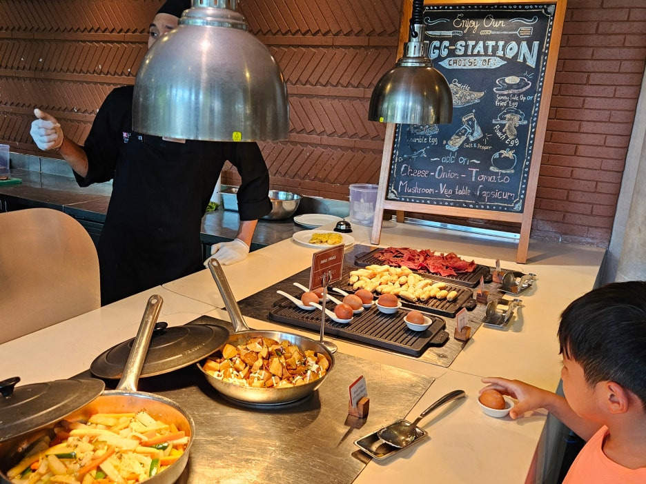 에그 스테이션에는 다양한 달걀 요리와 베이컨 소시지들이.