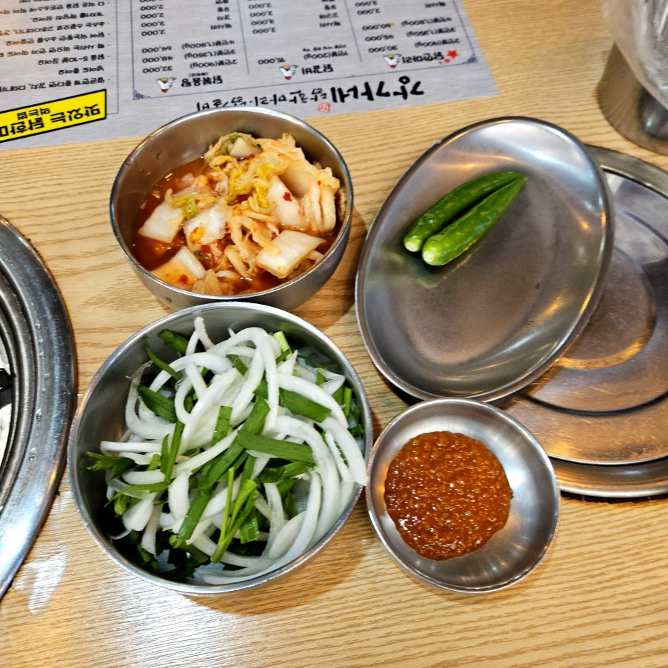 깻잎은 원래 기본 찬에는 없었지만, 셀프 코너에서 가져왔다. 아무래도 닭갈비도 함께 먹을 수 있는 곳이라 깻잎을 비치해 두었던 듯. 그래서, 깻잎에 한번 싸먹어 보니, 이거 또한 색다른 맛이네. 깻잎의 향이 김치와 함께 잘 어울린다.