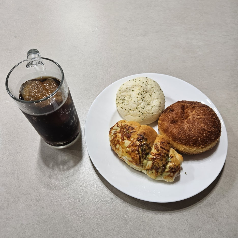 콜라와 함께 먹어보는 각각의 빵들. 내가 먹은 것은 크림치즈빵, 카레 고로케, 소시지 빵. 한 끼를 이걸로 해결했다.
