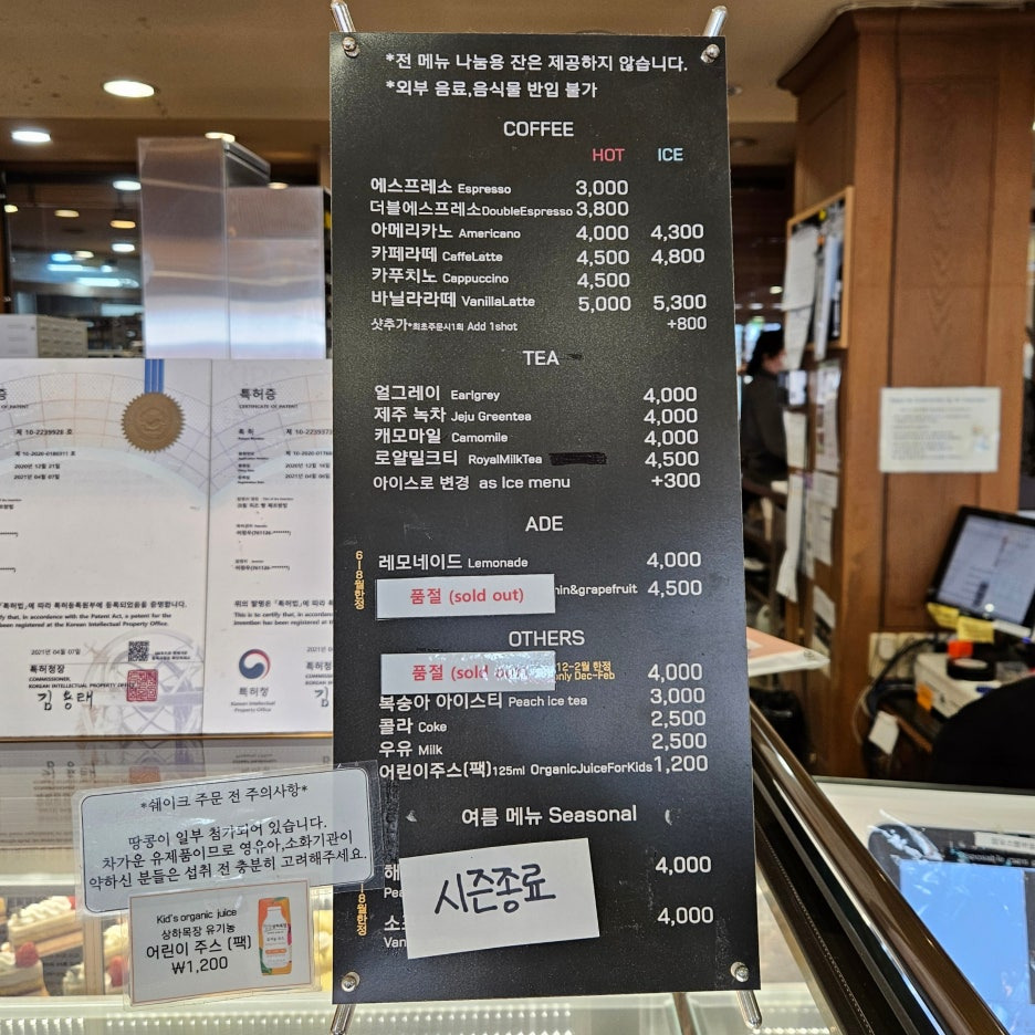 이렇게 자리가 마련되어 있다는 것은 음료도 판매한다는 것. 커피류와 차, 에이드 등이 있었다. 가격은 그리 비싸지 않아서, 빵과 함께 즐기기에 좋은 듯.